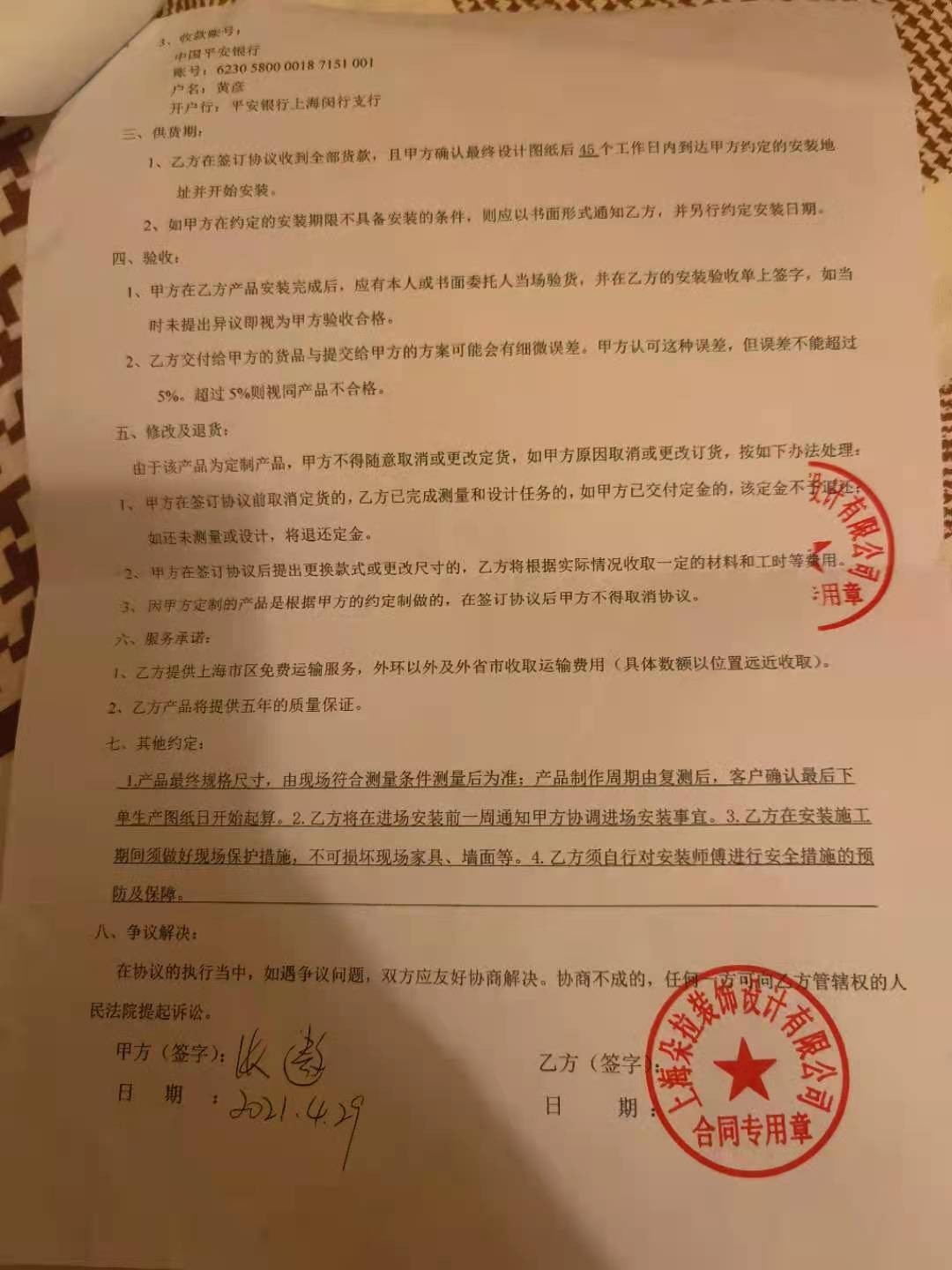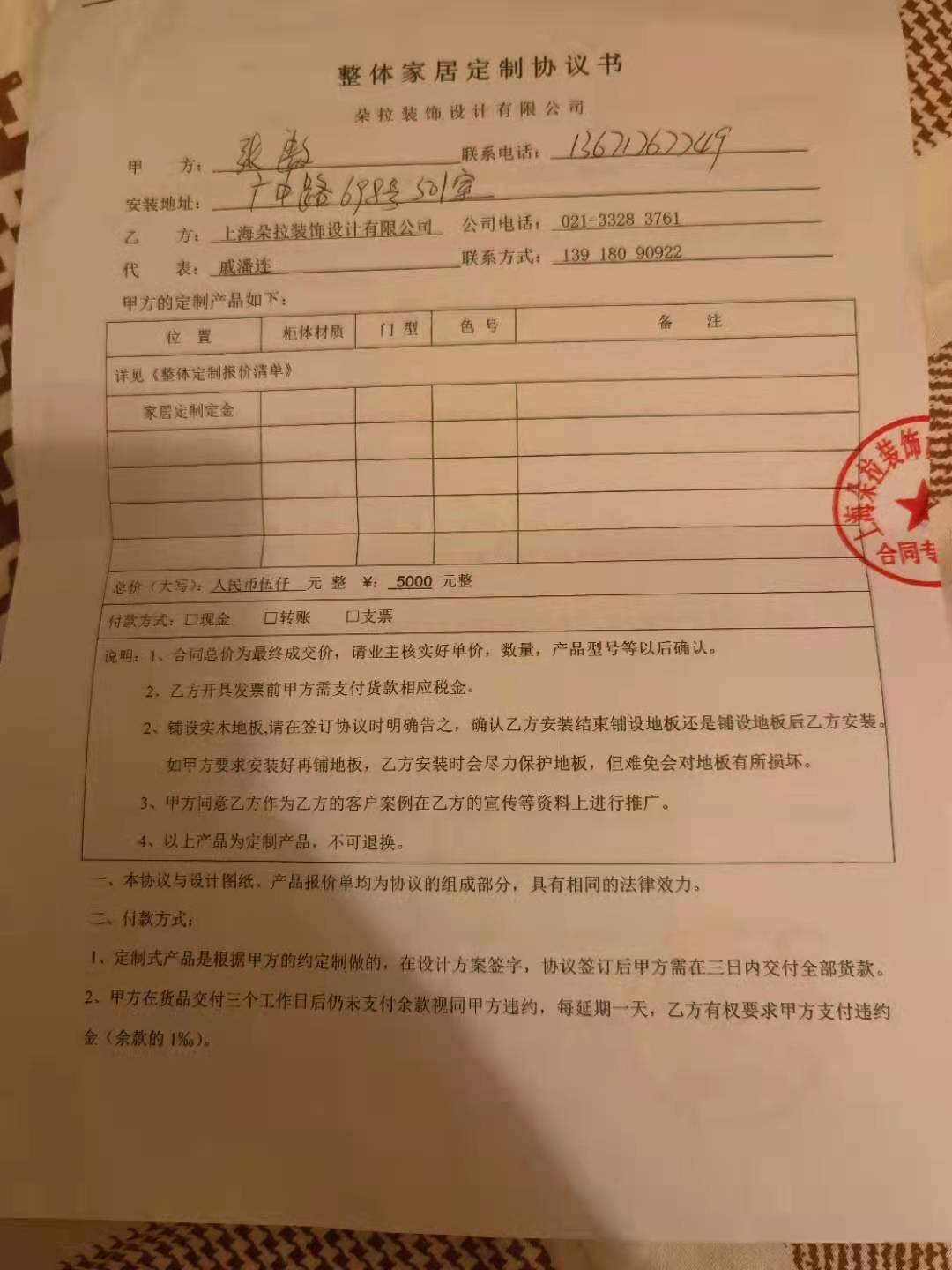 | 投訴類型 | 合同糾紛 | 投訴人 | 張** | 被投訴單位 | 上海朵拉裝飾設計有限公司 |