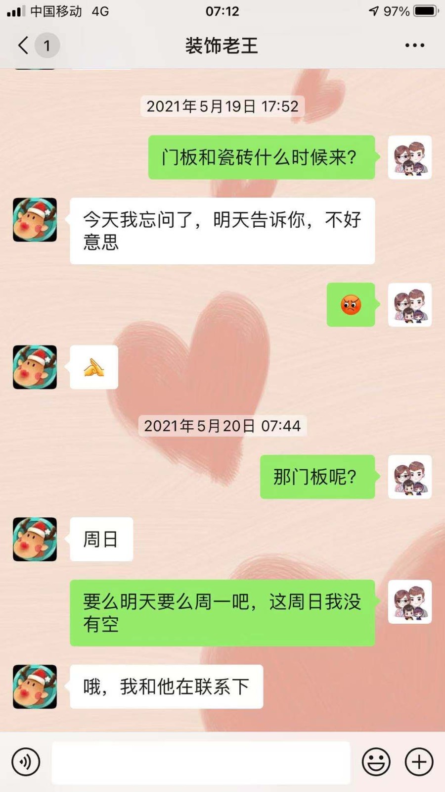 (1)惡意拖延工期:原定12月10日裝修至3月30日結(jié)束。截止今日7月22日仍存在諸多爛尾事項。從5月份起,工長不來工地,電話、微信不接不回,愛客的同事在群里就裝修跟進事宜找,也概不回復(fù)。
