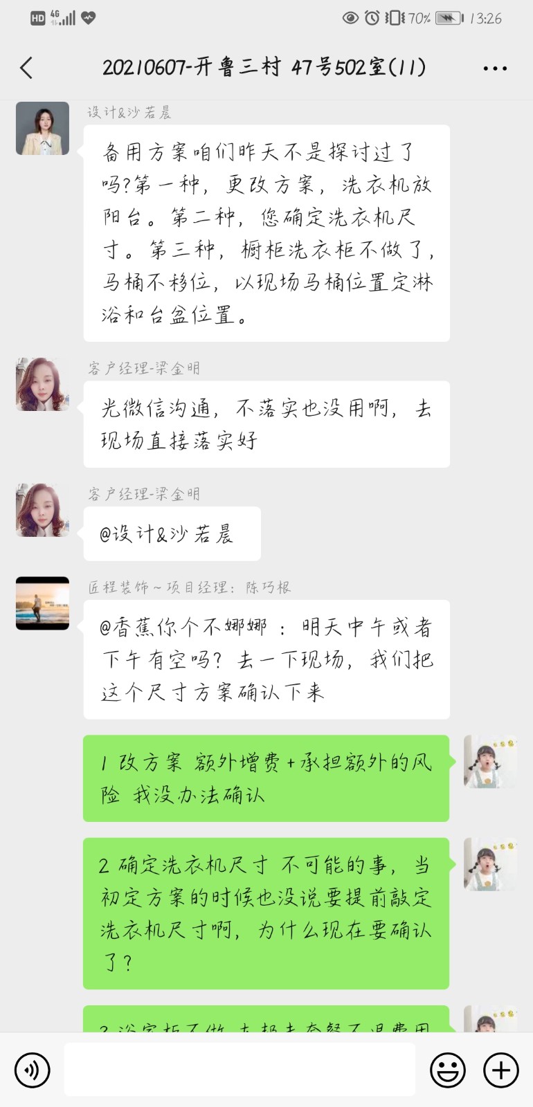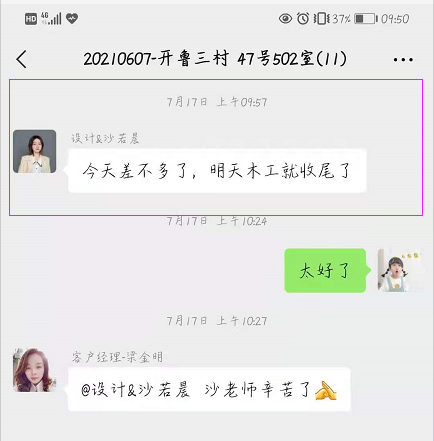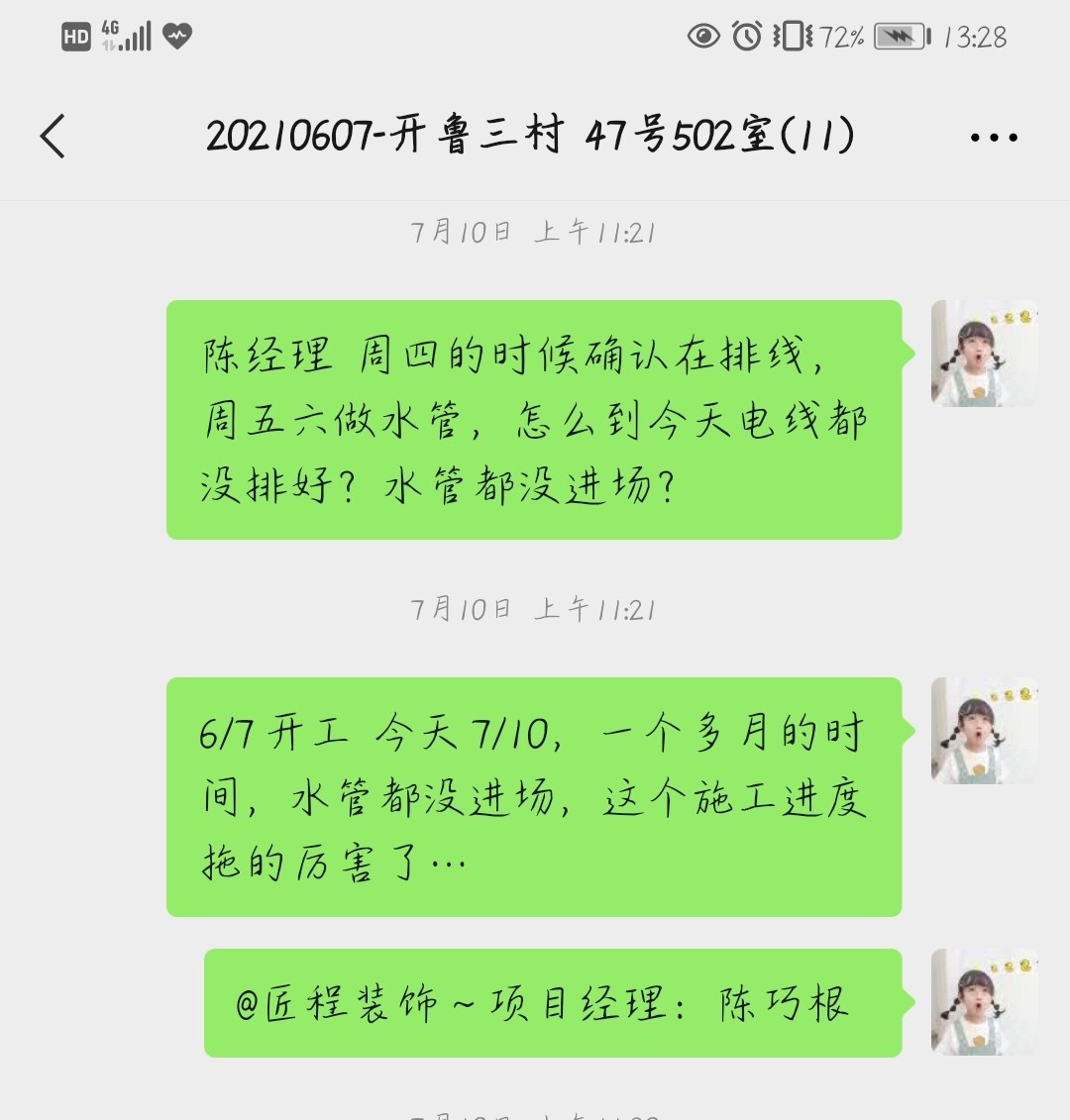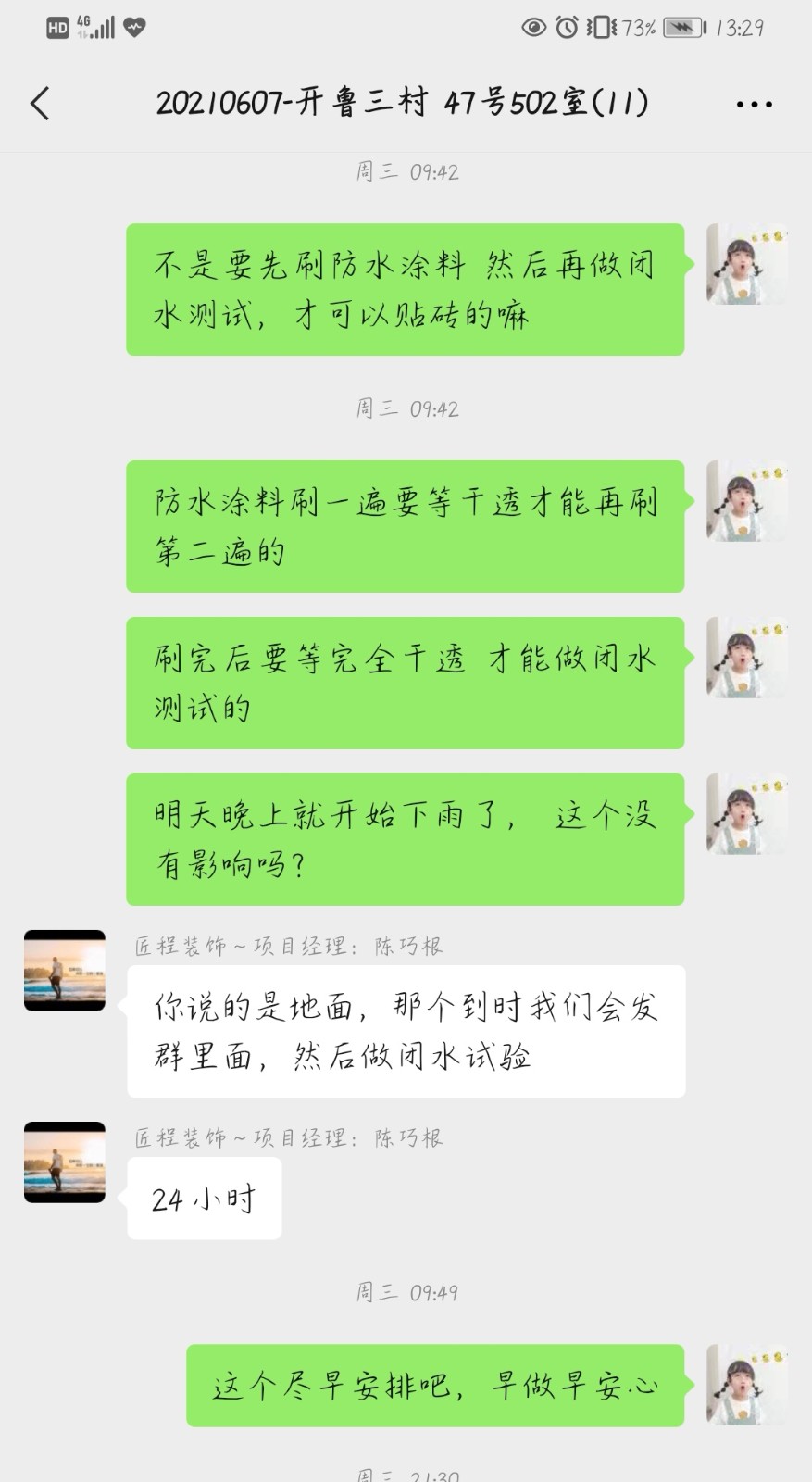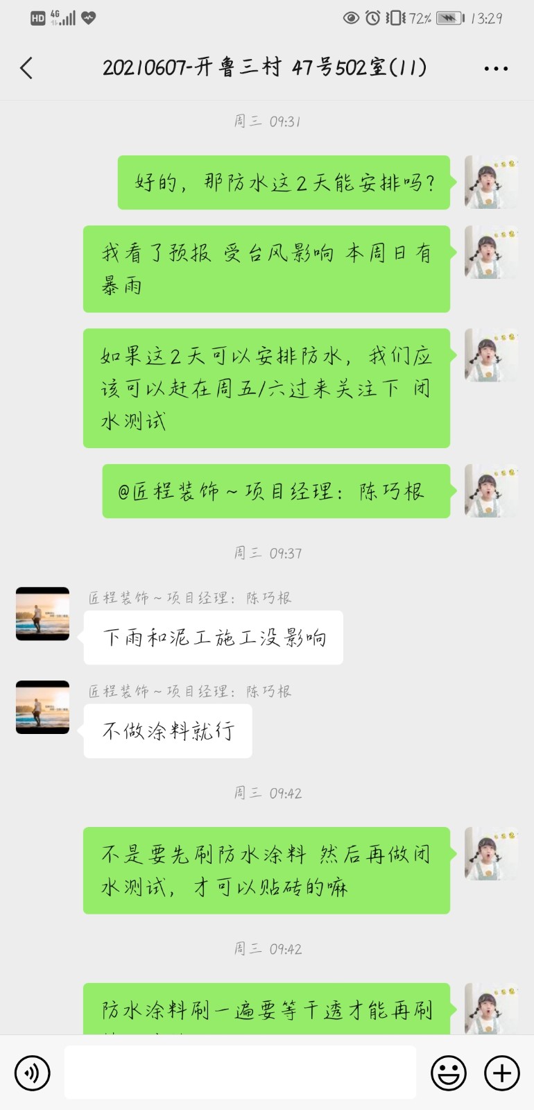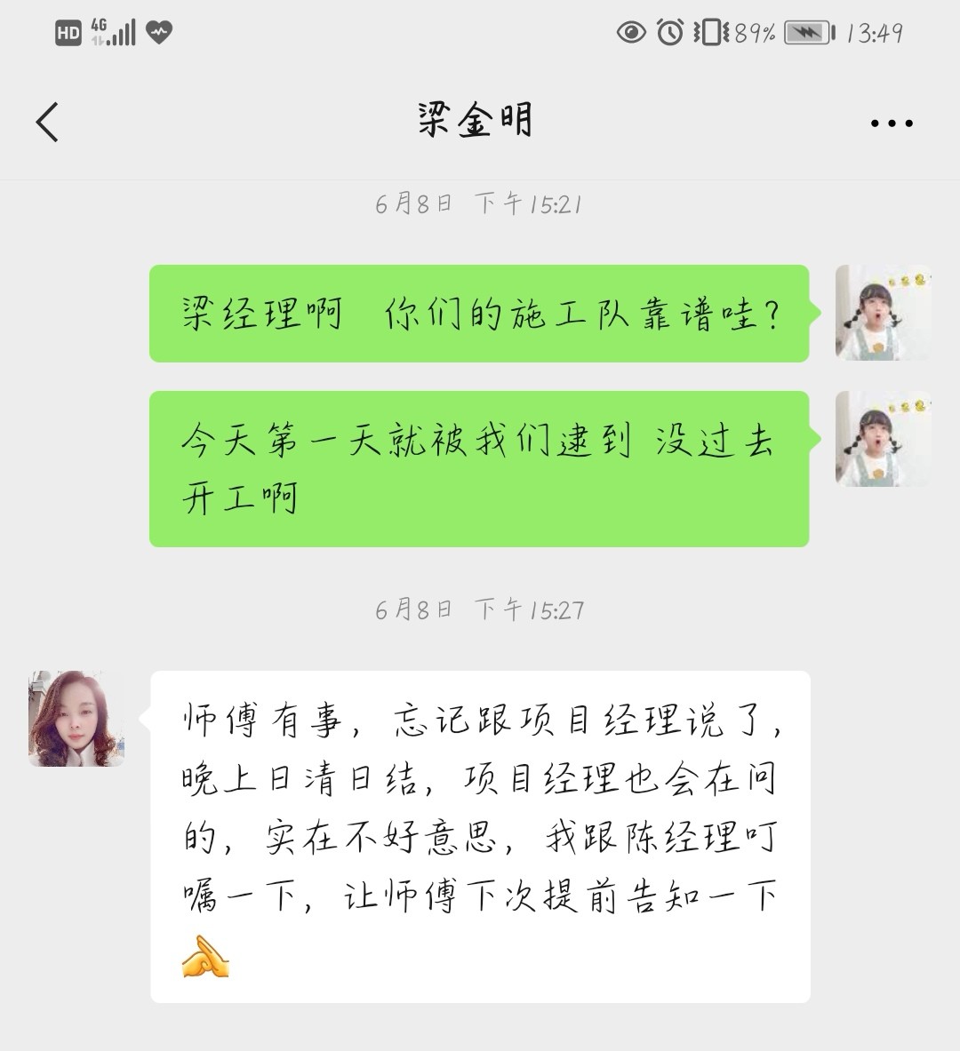 處理問題的態(tài)度是誠(chéng)懇的,可能工程太多,應(yīng)接不暇 希望有任何問題雙方都能及時(shí)溝通,另外裝修過程中有需要等涂料干透再次粉刷情況存在 希望施工隊(duì)能考慮每家戶型通風(fēng)情況不同而酌情調(diào)整施工安排(如全明通風(fēng)性好戶型可隨意安排,如深井 暗戶型 通風(fēng)不好 盡量調(diào)整到好天施工)而不是按部就班執(zhí)行施工。