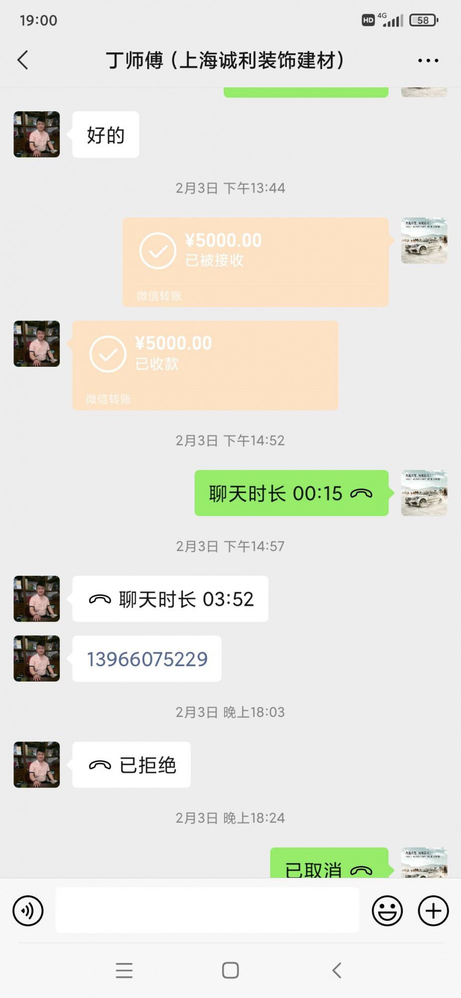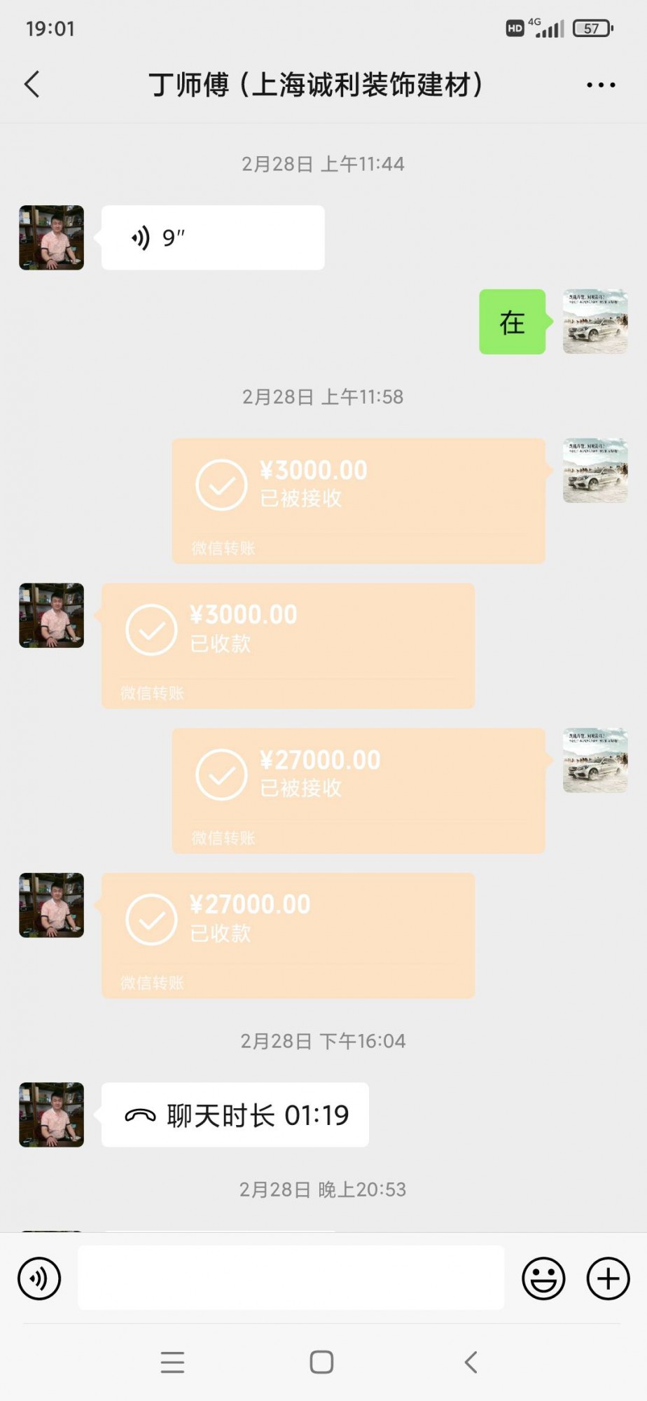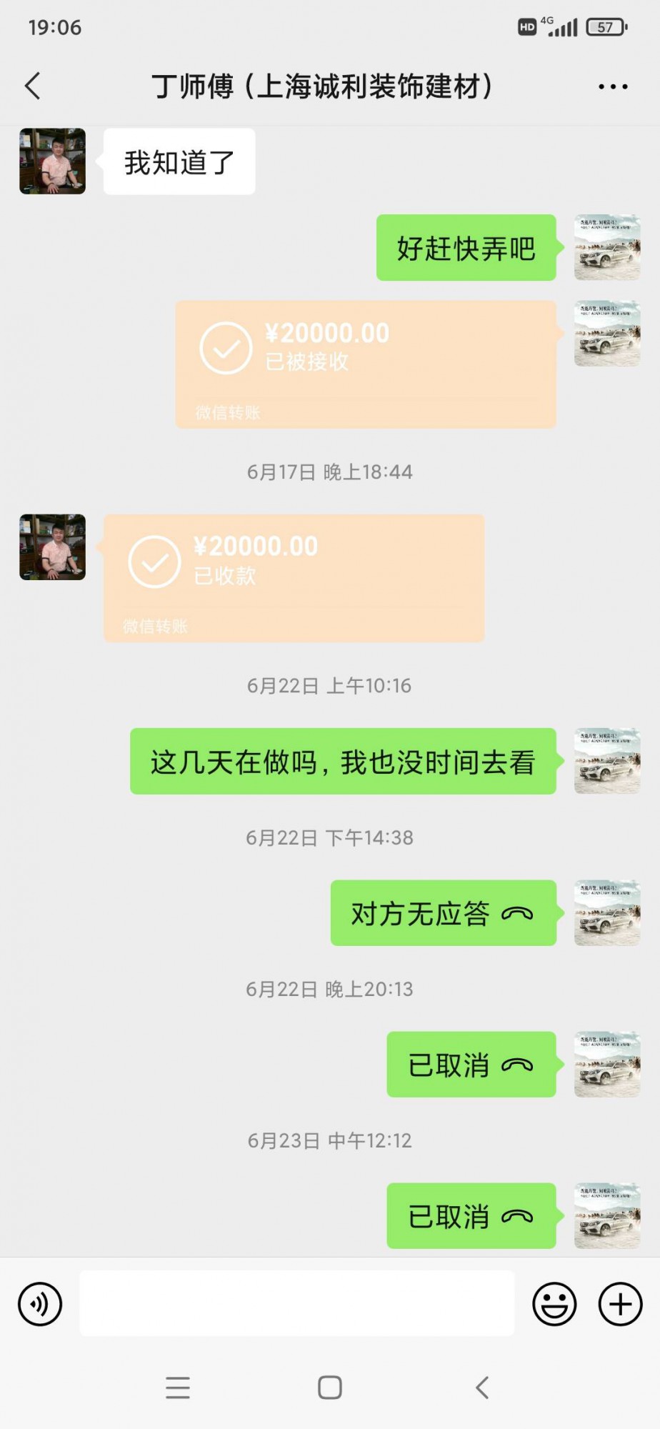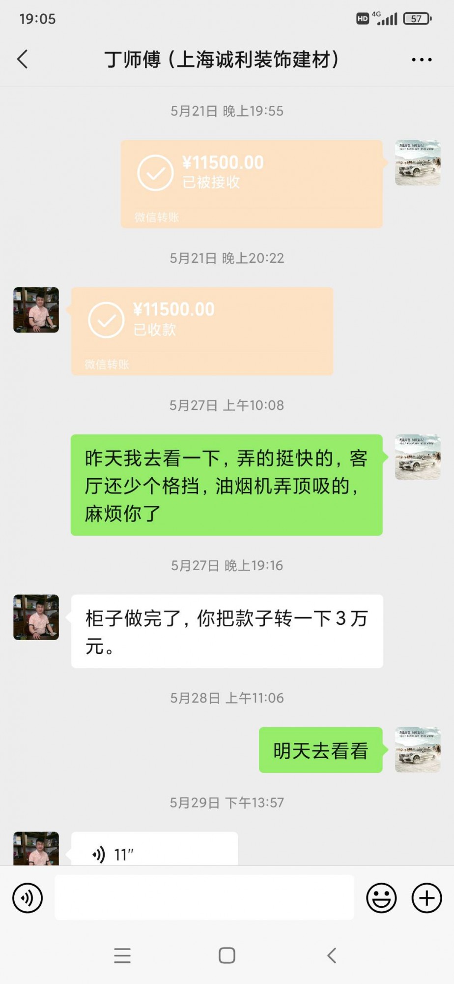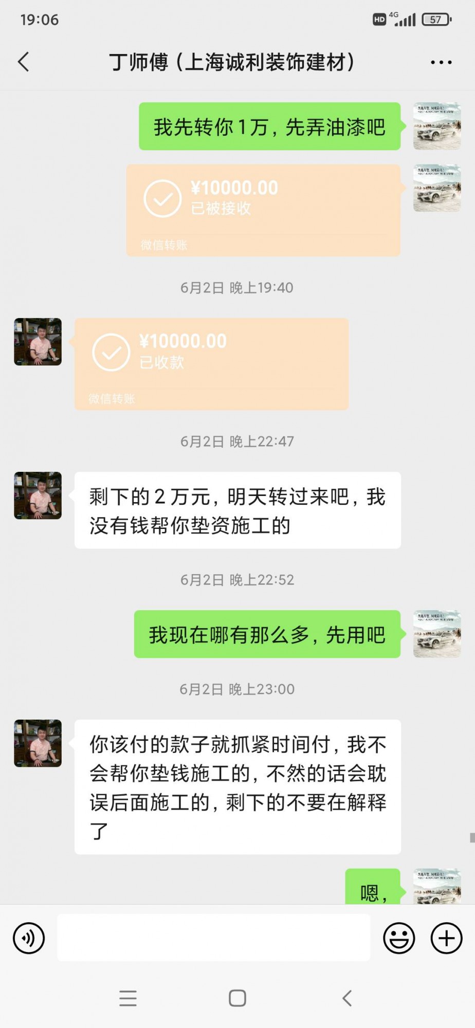 后面就開始木工做柜子2021-5-27木工離場,告訴我柜子做完了催我付款.我說我明天去看看,看過發(fā)現(xiàn)客廳隔斷柜沒做,就打電話跟他說了這事,他就同意了讓我跟木工說下就行,我就跟木工說了, 老板同意了所以我也就放心了我就付款給他.2021-6-2我說先轉(zhuǎn)你10000吧,先把油漆做了在付2萬,他一直催我說我不給墊錢的,抓緊錢2W付了,不然影響工期,我也無奈心想反正都要付的就給他吧2021-6-17我就又付了20000,后面就想打電話問問弄到哪里了,打電話不接.