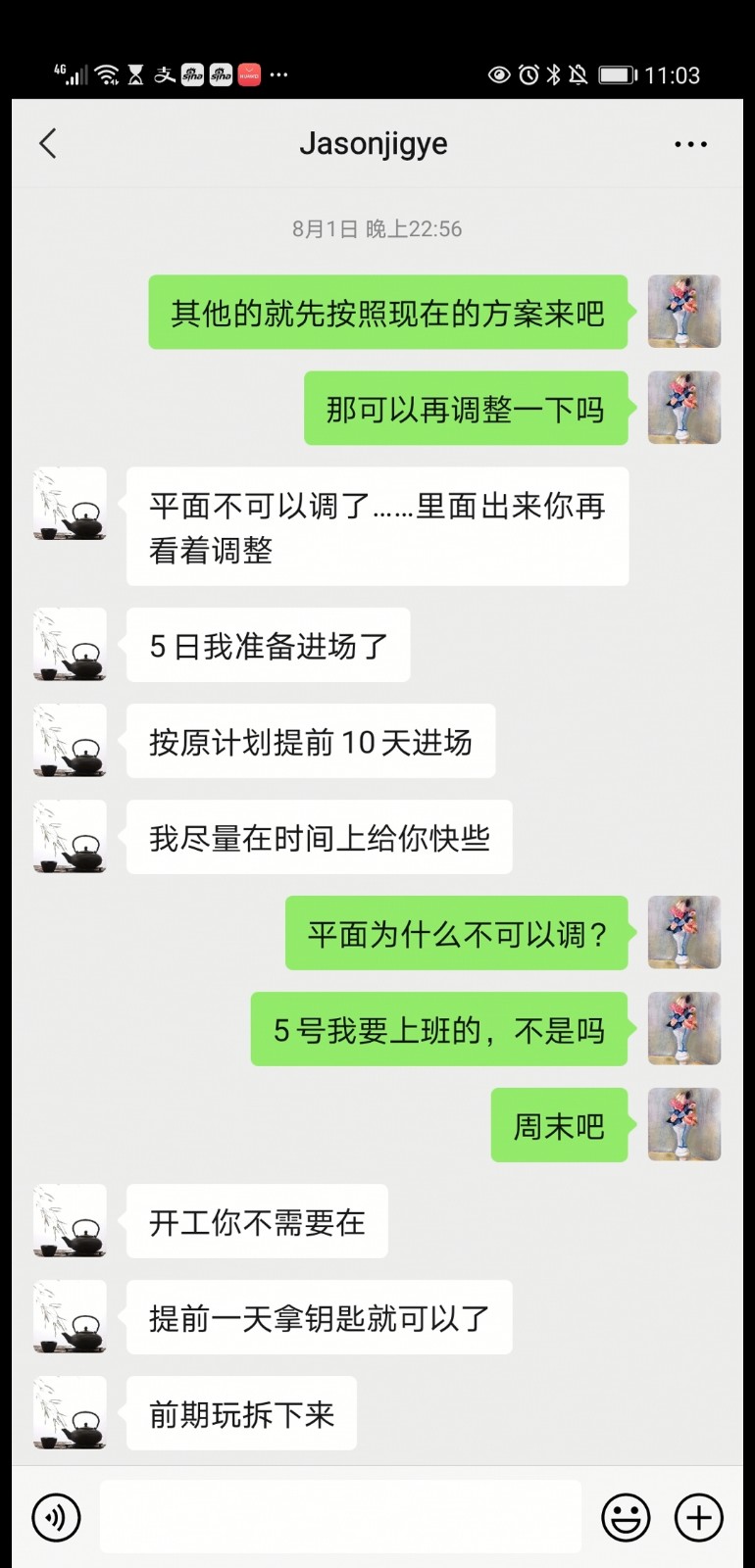8/13,我?guī)е谌奖O(jiān)理一起去,監(jiān)理對他提出的預(yù)算清單提出了很多質(zhì)疑,但設(shè)計(jì)師又說預(yù)算只是公司內(nèi)部流轉(zhuǎn)的,不做數(shù)的(這和之前微信里說的嚴(yán)重不符)。對為什么清單里沒有品牌型號,他回答,這還沒有市場調(diào)研,怎么寫的出?問他那什么時(shí)候可以提供調(diào)研好的材料清單,他說要17號。問他,在你提供的價(jià)格范圍內(nèi),是否可以自行選其他品牌?被拒。是否可以半包?被拒。那消費(fèi)者憑什么交付了那么多錢,要被迫使用自己不認(rèn)可的材料品牌呢?他直接發(fā)飆,說本來這就不賺錢,是出于幫忙,現(xiàn)在出來那么多幺蛾子,最后直接口出狂言走人了……
