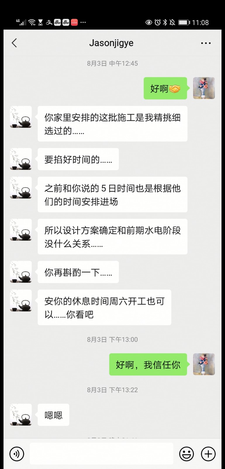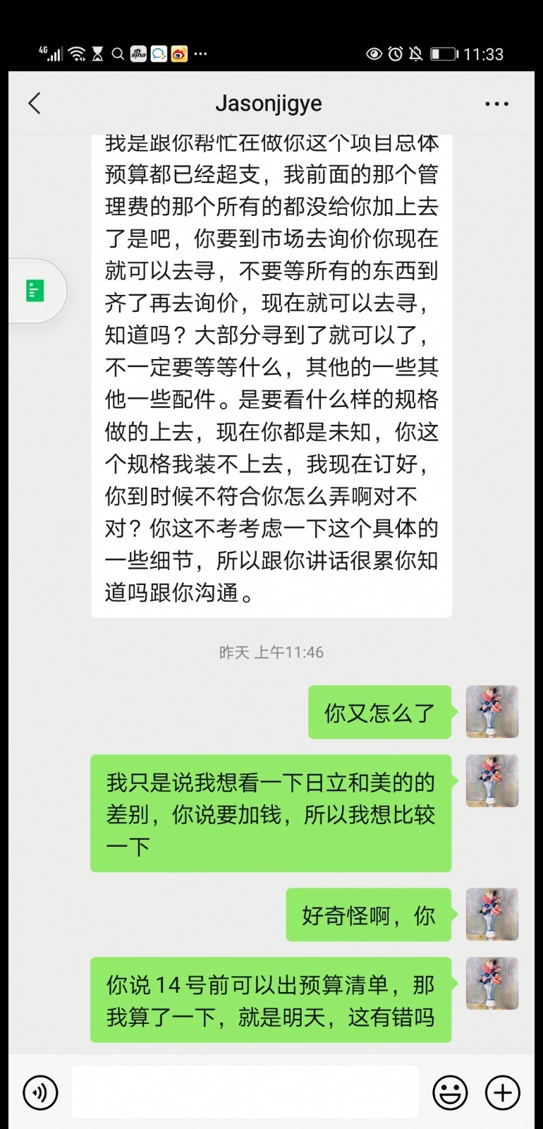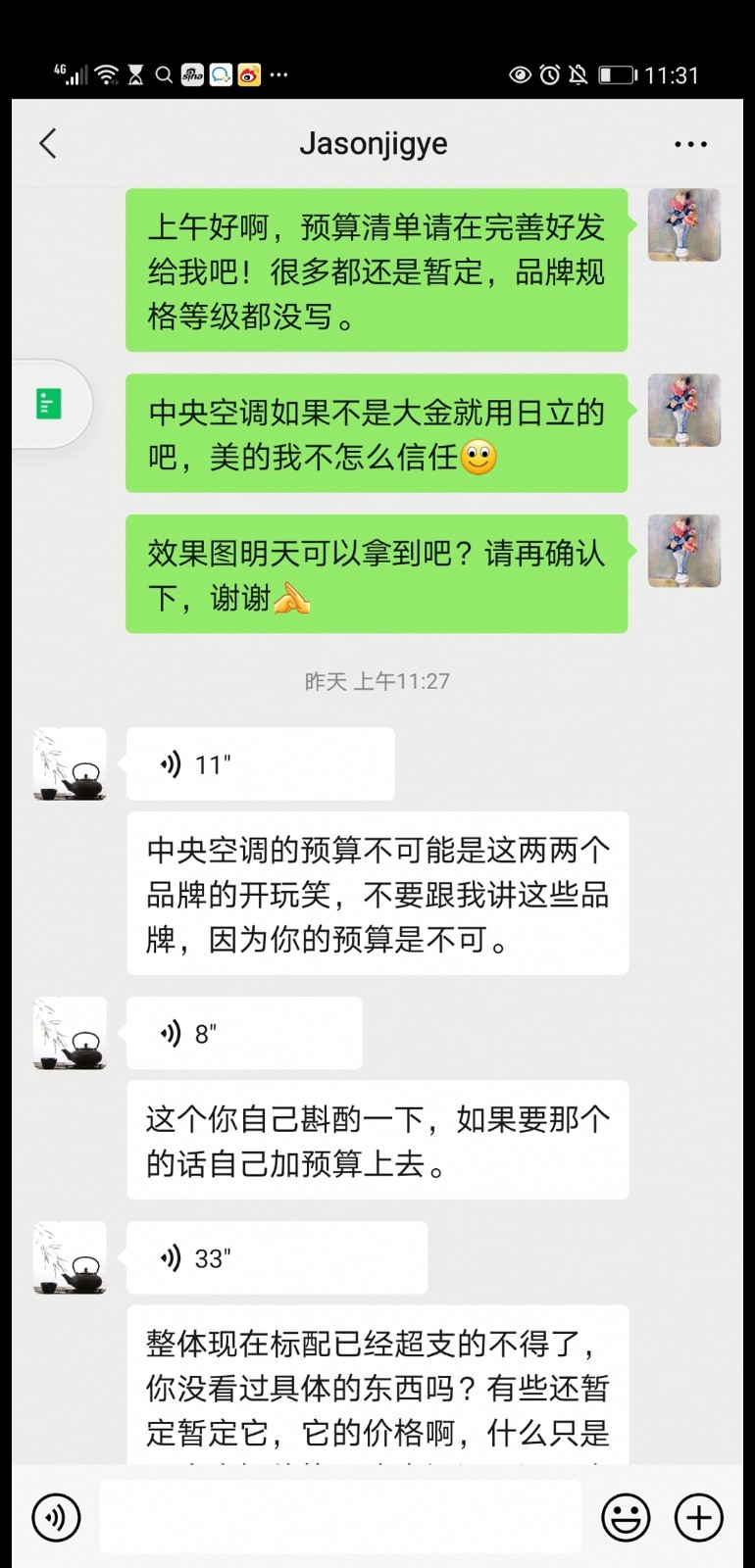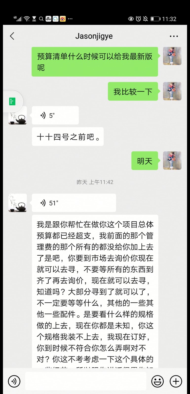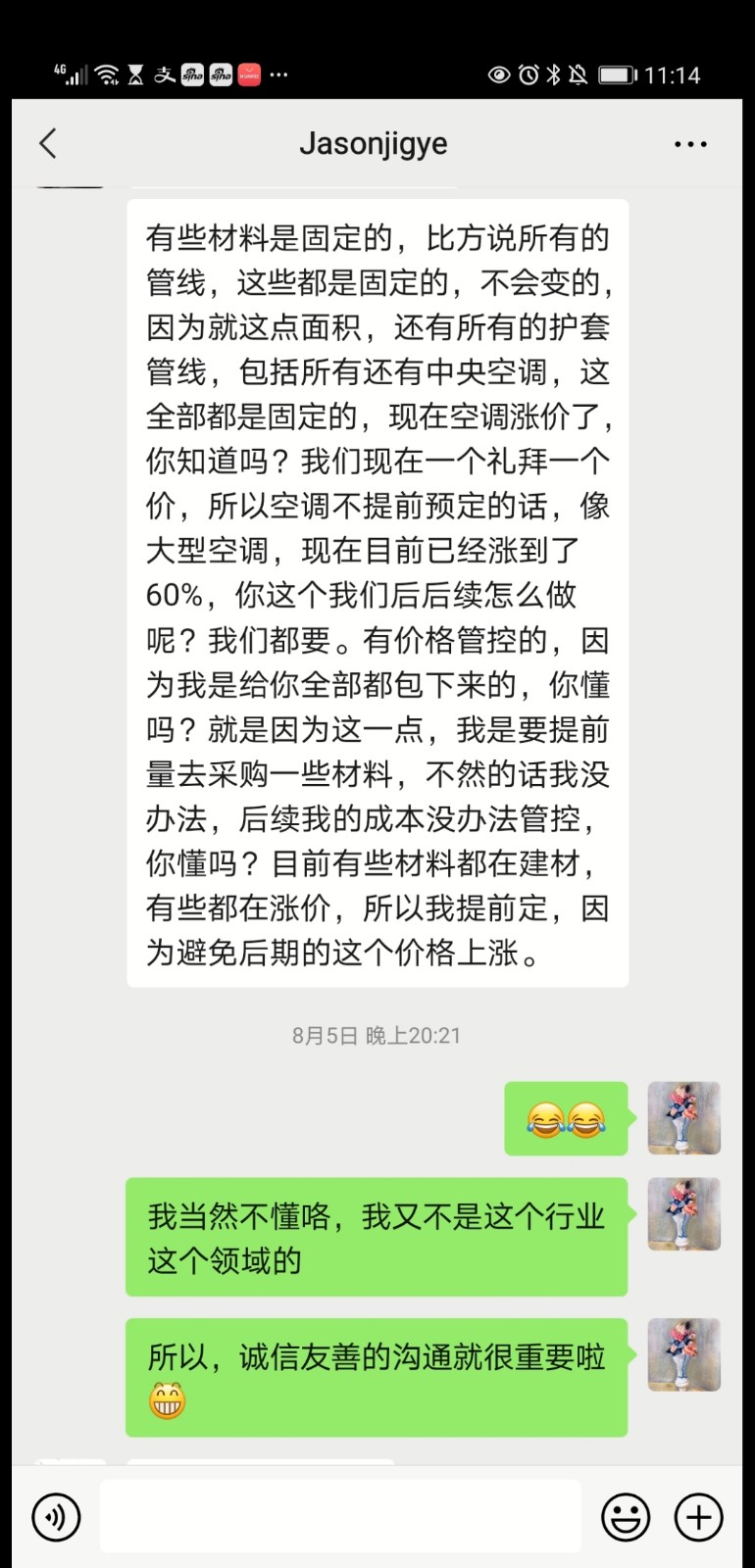 8/11,他主動聯(lián)系過來,發(fā)了我看不懂的文字,我提出要語音溝通。語音過程中,他又提出要進(jìn)場開工,要快點(diǎn)去采購材料。我提出要看材料清單。之后,他把預(yù)算清單發(fā)了電子版給我。清單里,所有主材的品牌、規(guī)格、等級、型號都沒有,中央空調(diào)和軟裝也沒體現(xiàn)。對此我提出了質(zhì)疑,問這應(yīng)該不是最終版吧?他回應(yīng)說,都在里面了,只有一項(xiàng)拆房費(fèi)用沒算計(jì)去,這個(gè)預(yù)算很精確了。我對中央空調(diào)提出疑問,合同顯示總價(jià)包含的,為什么沒有列在清單里,你準(zhǔn)備用什么品牌?他回應(yīng)說,用美的也得32000。我說你之前一直承諾是大金,再不行也是日立,怎么突然就美的了呢?他說國內(nèi)只要是品牌商,質(zhì)量都是信得過的,哪有那么多講究?我提出,那你給我把空調(diào)列進(jìn)去,我比較一下價(jià)格到底差多少?他發(fā)飆,說我從來就不信任他,又對我進(jìn)行人生攻擊,說我一直是極度缺乏安全感……