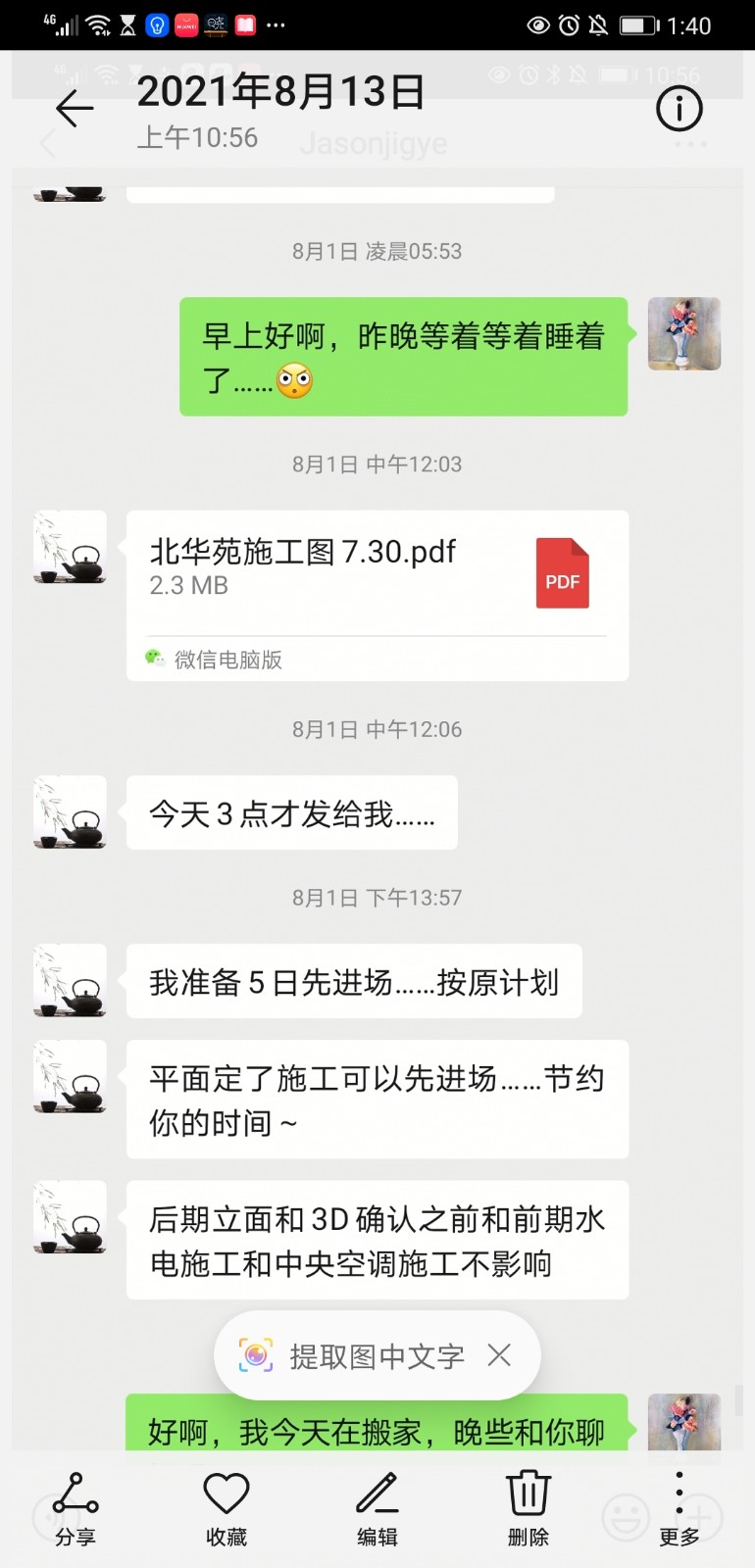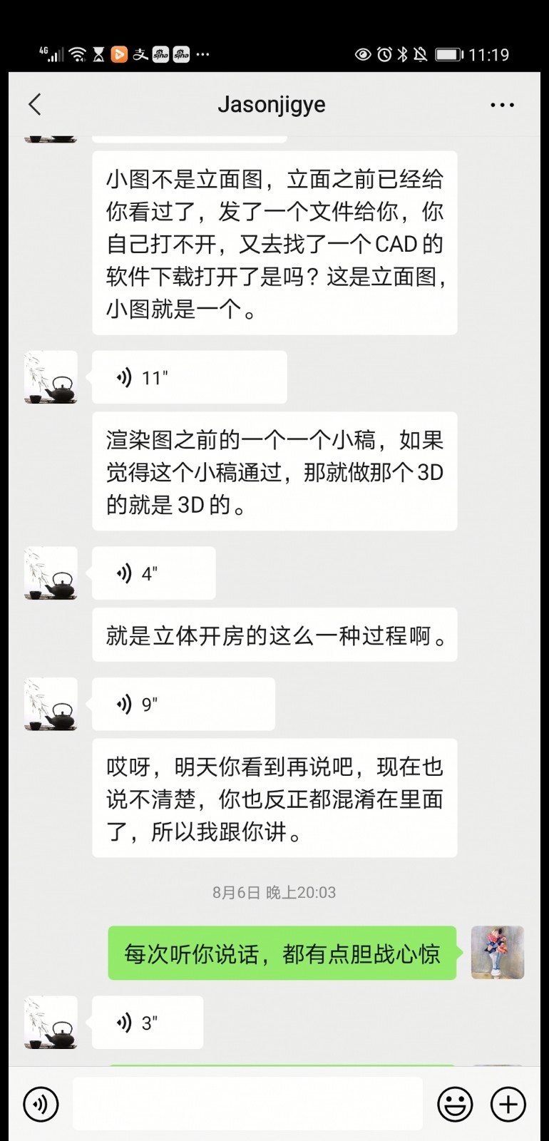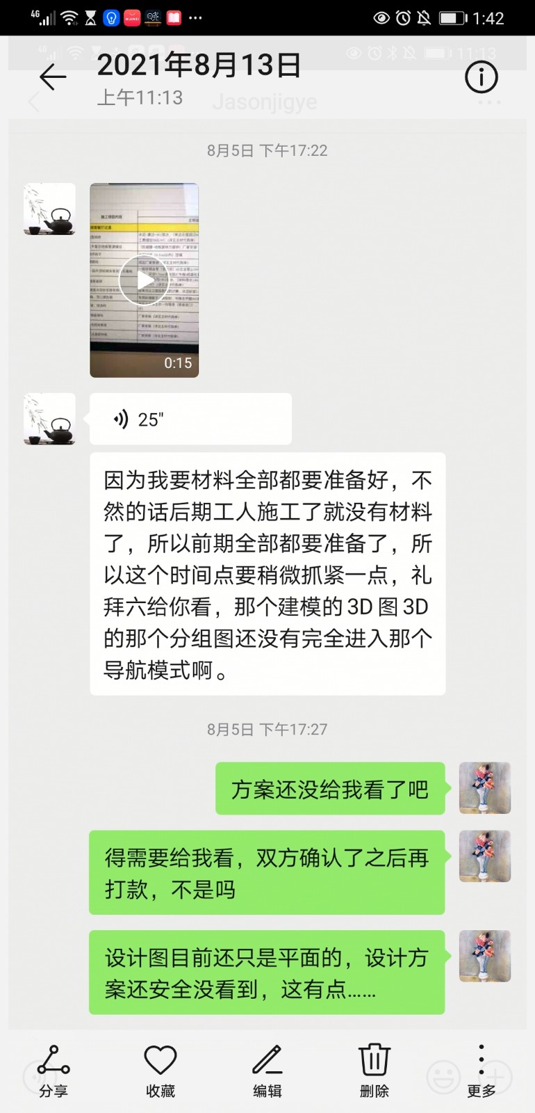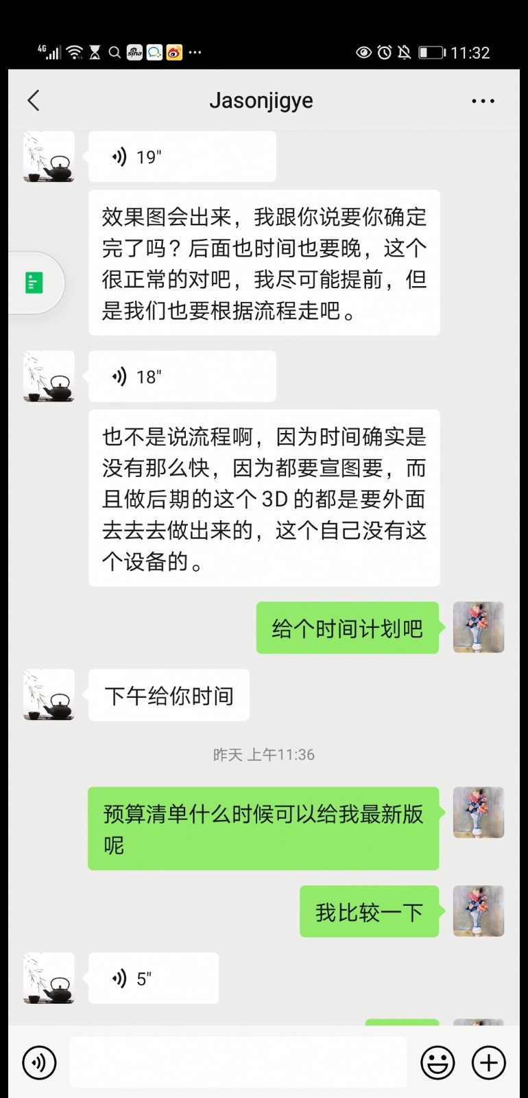 8/5,他發(fā)了個(gè)正在編輯材料表的15秒的短視頻,說可以打第二筆款了。我提出,不理解這種做法,希望一步步按照流程來。他開始顯現(xiàn)惱怒情緒,說材料不斷在漲價(jià),預(yù)算已經(jīng)嚴(yán)重超支……我說,那就抓緊出小圖,效果圖,給我確認(rèn),才是當(dāng)務(wù)之急。他同意說8/7下午出。