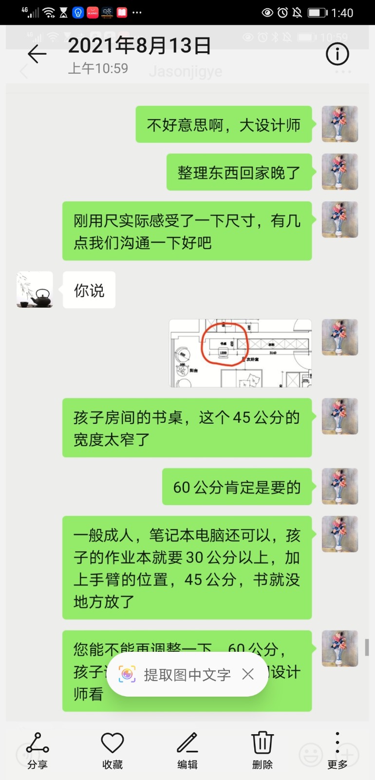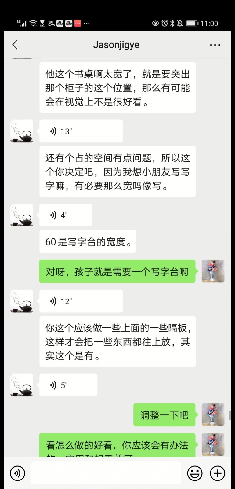 8/9,因?yàn)槔鄯e的不安越來越強(qiáng)烈,我微信里反反復(fù)復(fù)提出要見面溝通。他說要去杭州,不在上海。我說,那你給我你們公司具體負(fù)責(zé)制圖的同事,我直接和他對接,被他拒絕。之后又提出晚上晚點(diǎn)電話溝通,被我拒絕。無奈,他同意晚上見面。見面后,我把前期設(shè)計(jì)過程中所有的細(xì)節(jié)都一一梳理了一下,期間,發(fā)現(xiàn)他對于圖紙是不熟悉的。有好幾處,他說的和圖紙都是不符,在我一再要求下,他去比對CAD圖紙,才發(fā)現(xiàn)自己強(qiáng)調(diào)的尺寸是不對的,讓我很無語。期間,我提出說從小圖看,顏色的搭配,我還是有自己另外的想法。他說,那你快點(diǎn)把色卡發(fā)給他看。
