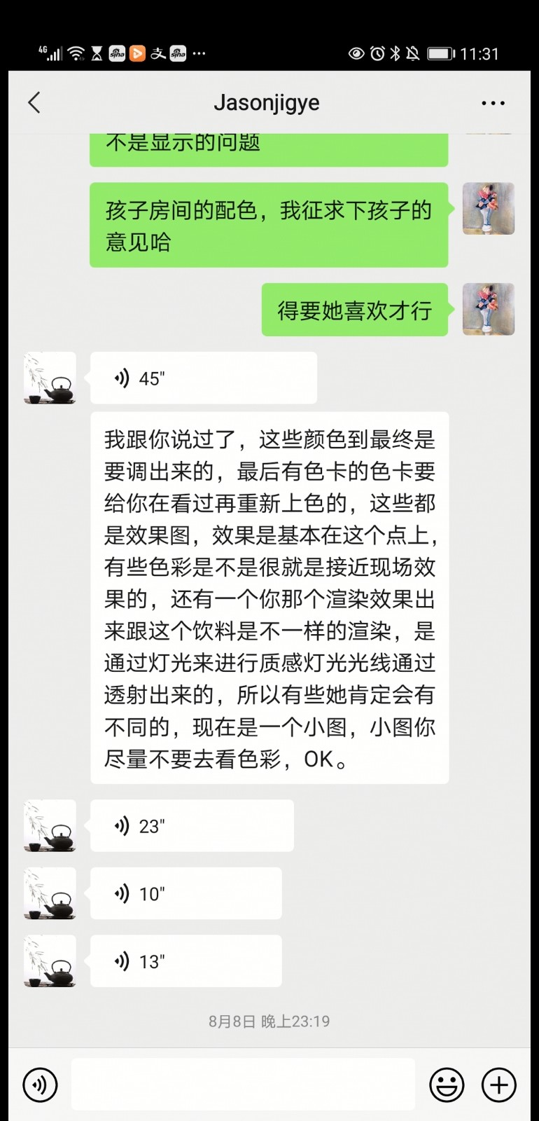 8/7,設(shè)計(jì)師通過微信發(fā)了小圖,因?yàn)椴皇窃瓐D,放大看都是糊的。玄關(guān),電視墻以及書桌等幾處之前存在疑問的面,都沒有在小圖里體現(xiàn)出來。他說,小圖你只需要確認(rèn)顏色搭配,細(xì)節(jié)要到3D效果圖階段再看。我提出孩子房間里的配色我不喜歡,希望修改。他又一次惱怒,說已經(jīng)這個(gè)階段了,怎么還要改?我說,你剛提供配色,我在當(dāng)天提出,怎么是晚?
