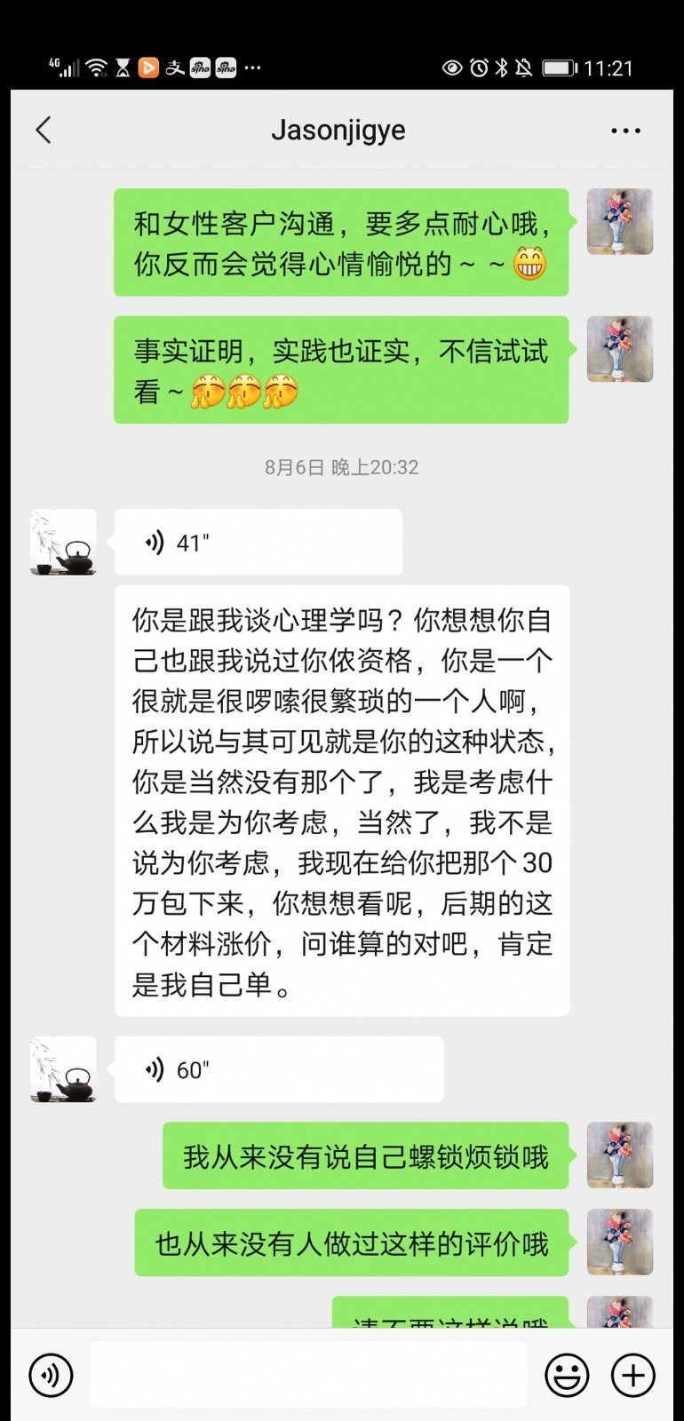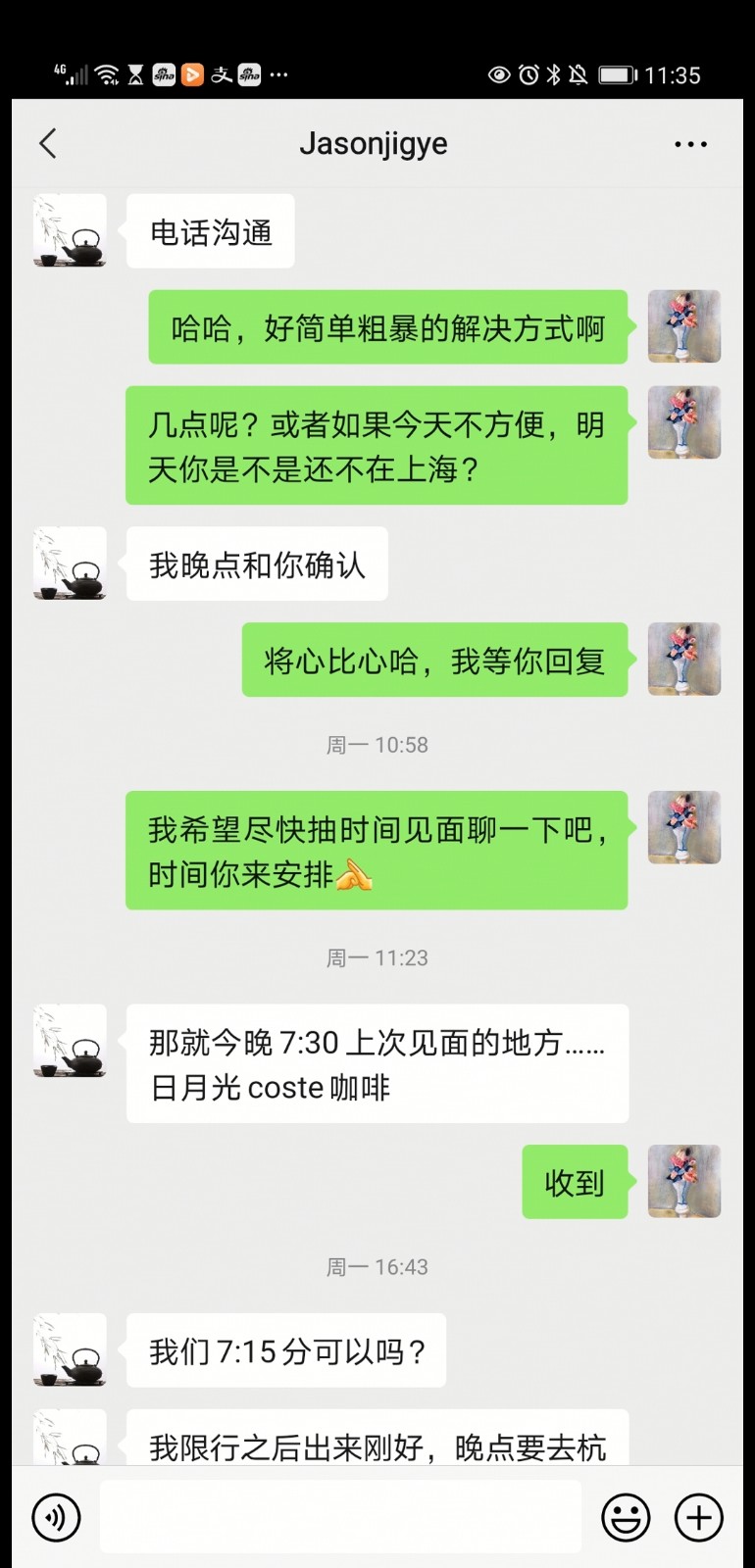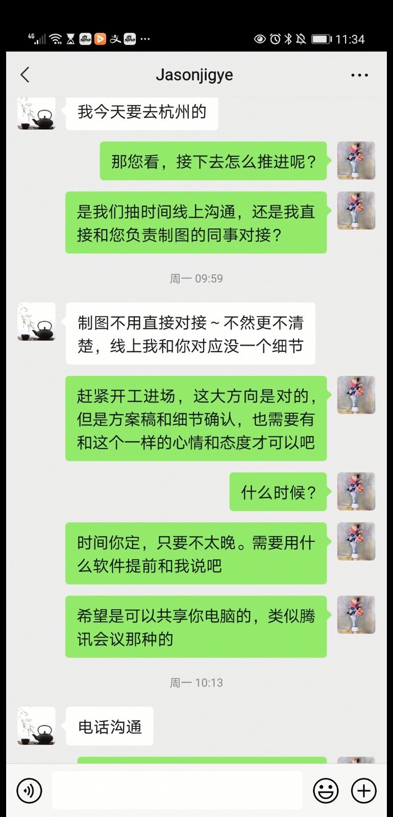 l 在以上這幾輪溝通中,我無數(shù)次提出希望見面溝通圖紙細(xì)節(jié),都被他拒絕。我提出或者用騰訊會議等軟件共享他的畫面也可以,也被拒絕。他說電話就可以。唯獨(dú)的一兩次電話也是微信上催促好多次,到很晚才開始,又匆匆結(jié)束,期間態(tài)度也很惡劣。