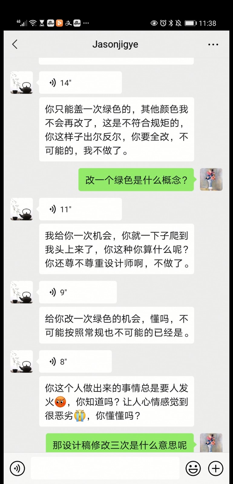 8/10,我在網(wǎng)上搜了兩個(gè)顏色搭配,發(fā)微信給他,希望替換。他直接在微信里發(fā)語音,態(tài)度粗魯,言辭惡劣,說我一改再改,出爾反爾,要再改不可能的,不做了!我驚呆了,問,這第一稿連效果圖都沒有出,合同上規(guī)定還可以改三搞,怎么就一次次都不能改。他不做回應(yīng),給他電話,語音幾次都不接,后來直接拒絕接聽。過了很久,發(fā)了文字過來,說就按原來方案定稿。令人錯(cuò)愕。