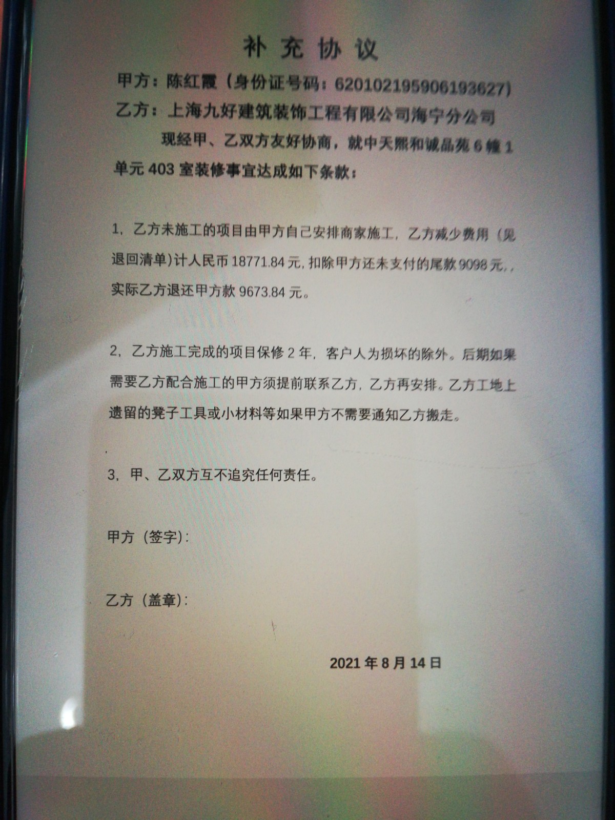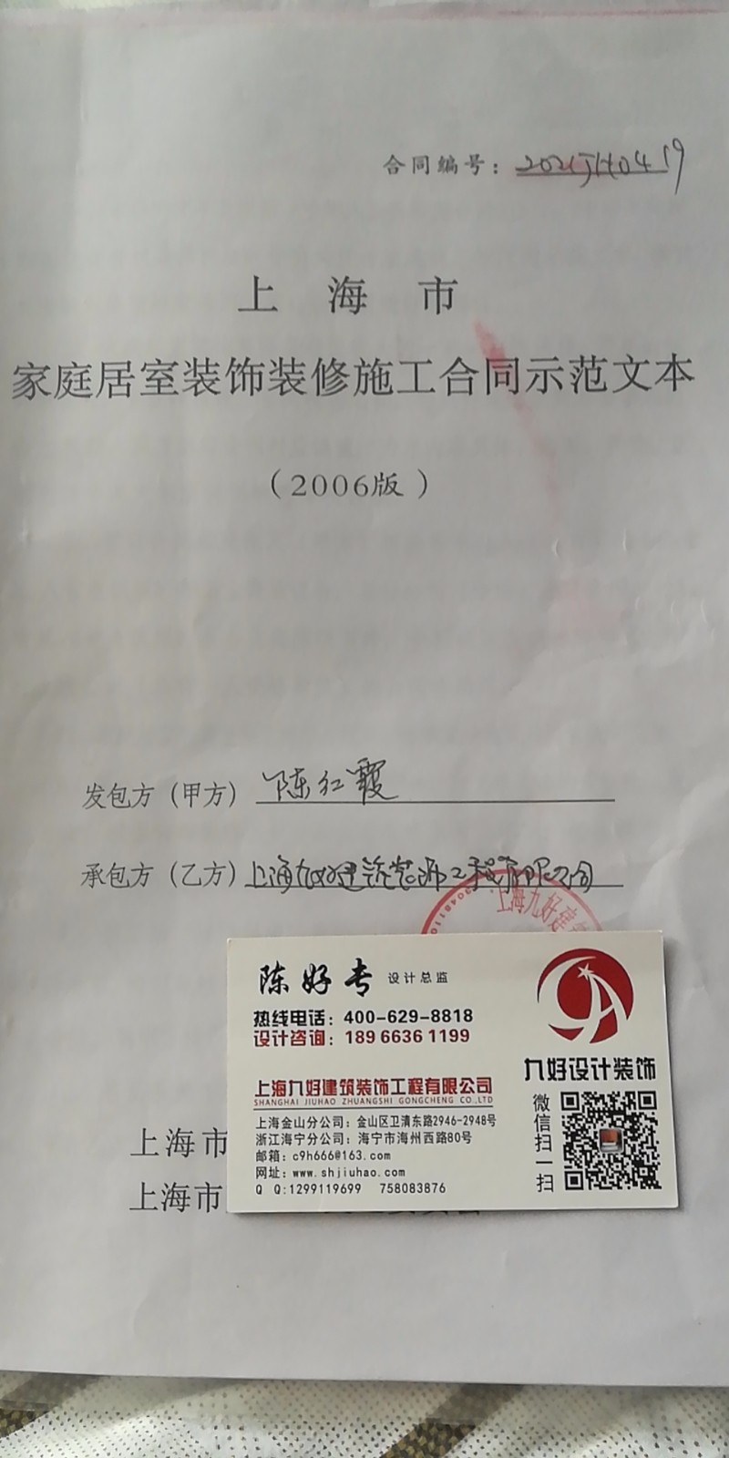 | 投訴類型 | 裝修增項 | 投訴人 | 陳** | 被投訴單位 | 上海九好建筑裝飾工程有限公司 |