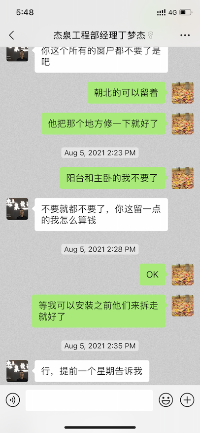 3. 8.5日裝修公司同意我把窗戶退掉,并約定在我安裝新窗戶之前一個(gè)禮拜通知裝修公司把舊窗戶拆掉?;谏鲜鰠f(xié)商,我重新找門窗廠家定制門窗,目前已經(jīng)可以安裝,可是現(xiàn)在裝修公司和原供應(yīng)商不同意把舊窗戶拆走。