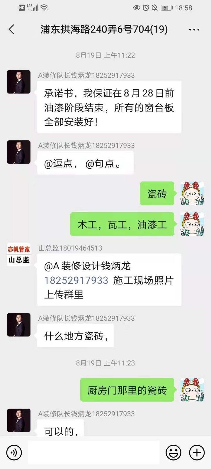 4.繼上次投訴后錢工長(zhǎng)承諾本月28日前全部完工(有微信聊天記錄為證),否則可以再次投訴,炳賠償全部損失,包括房租(有電話語音為證)。然而迄今為止僅刷了膩?zhàn)印?