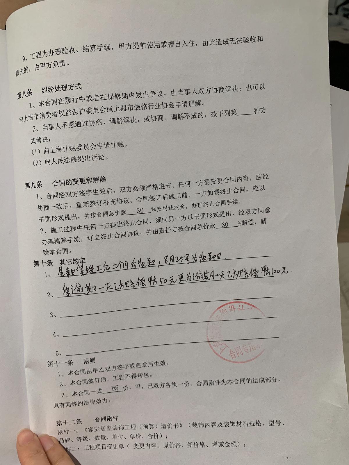 1、我合同寫的違約金一天100,目前尾款3900未交,最后踢腳線安裝時間2021年7月4日,合同時間6月25日竣工。還不算其他兩個小櫥柜門沒安裝,一些打膠等。項目經(jīng)理完全不讓扣違約金,一定要讓我付完余款。還揚言每天守樓下,不講道理。