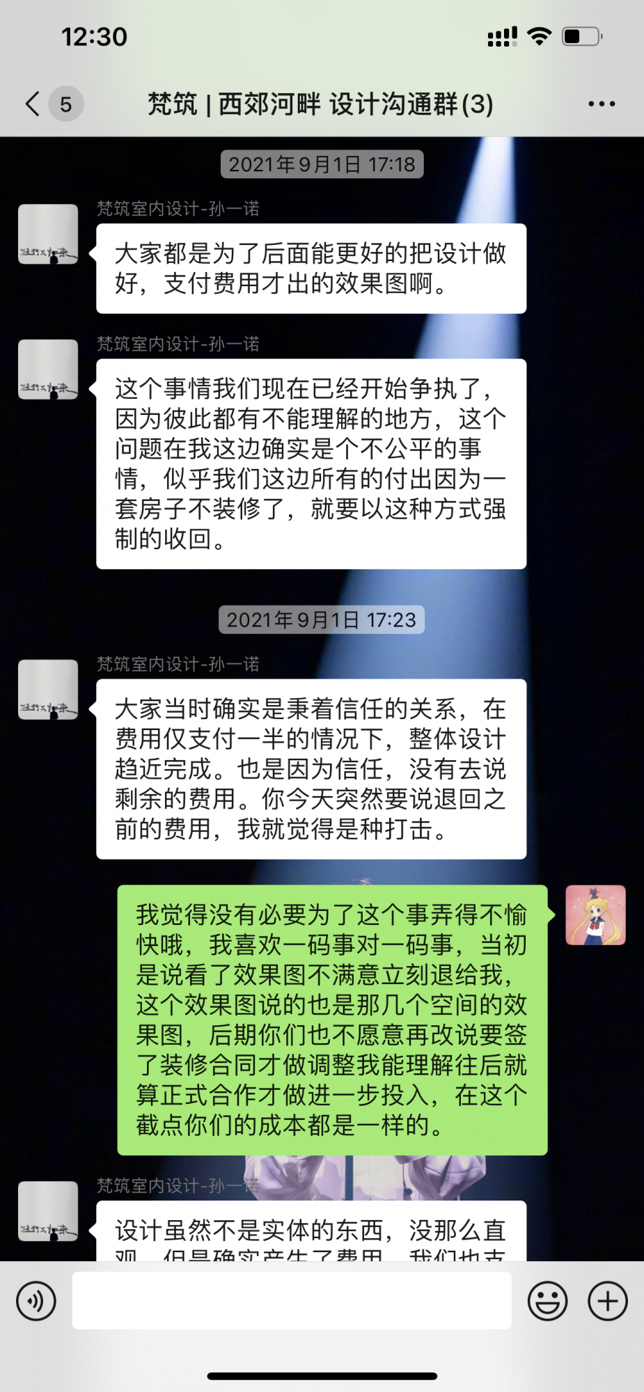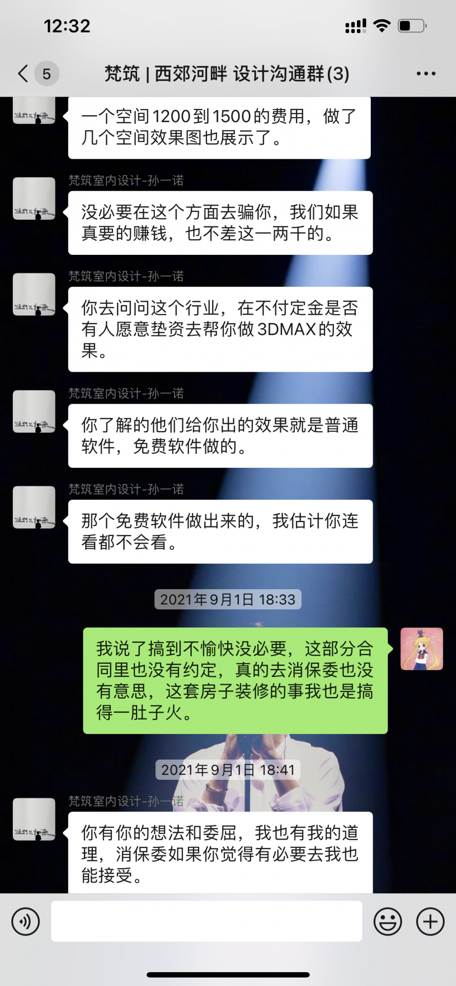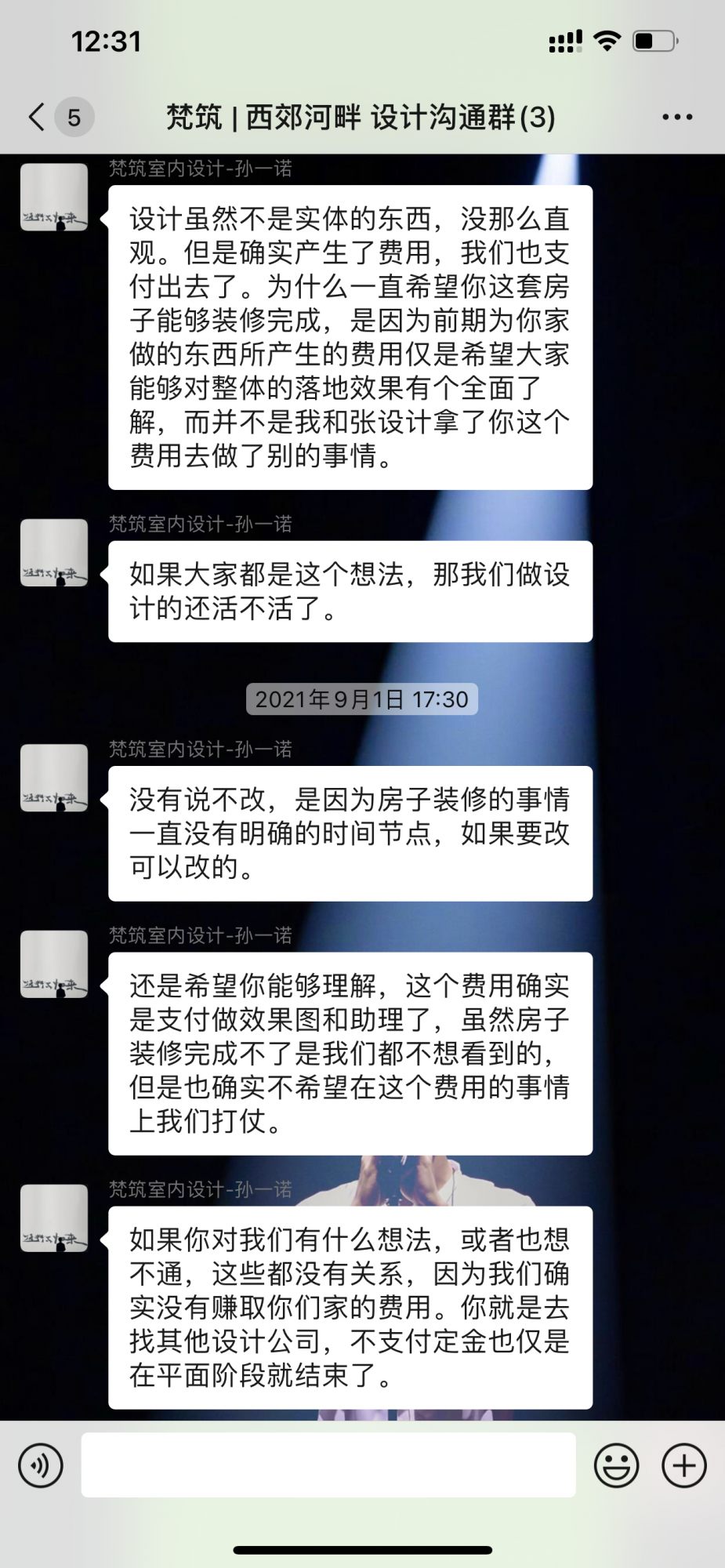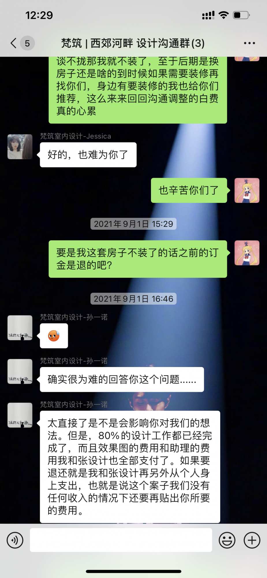 2021年6月12日[梵筑]設(shè)計(jì)總監(jiān)Jessica通過(guò)某家博會(huì)推薦與我聯(lián)系(一直聲稱(chēng)某享屋平臺(tái)推薦,后期我翻找記錄發(fā)現(xiàn)是某家博會(huì)推薦),當(dāng)時(shí)推薦了好幾家,做設(shè)計(jì)需要量房我家又有租客還未搬走未確定量房時(shí)間,其聲稱(chēng)裝過(guò)我家小區(qū)同戶型,拿他們的尺寸給我做設(shè)計(jì)(是否真實(shí)未知,看有投訴是一樣的套路),期間帶著圖紙來(lái)我家附近找過(guò)我?guī)状螠贤ǚ桨?,每次同?lái)的還有一位叫孫一諾的設(shè)計(jì)師(查了才知道不叫這個(gè)名,不知為何要改名,也是聲稱(chēng)是公司合伙人,夢(mèng)想家的簽約設(shè)計(jì)師),前期溝通設(shè)計(jì)沒(méi)有問(wèn)題,大致平面方案確定后要出效果圖時(shí)要求我先付一個(gè)設(shè)計(jì)訂金,聲稱(chēng)是相互信任的開(kāi)始,說(shuō)到時(shí)候不滿意或是拿著報(bào)價(jià)單與別家對(duì)比后不選擇他們會(huì)立刻退給我,不會(huì)像別家跟我扯皮,會(huì)當(dāng)場(chǎng)全額退還讓我放心,所以我也要求將合同及收據(jù)上的“定金”改為“訂金”,同時(shí)我也告知家里長(zhǎng)輩不希望我們整體翻新,希望我們就做簡(jiǎn)單局部的翻新,設(shè)計(jì)方案如果長(zhǎng)輩不同意我只能盡力勸說(shuō),一直都是再三強(qiáng)調(diào)最終還是要征求長(zhǎng)輩的意見(jiàn)如果達(dá)成不了一致可能會(huì)放棄裝修這套房子;