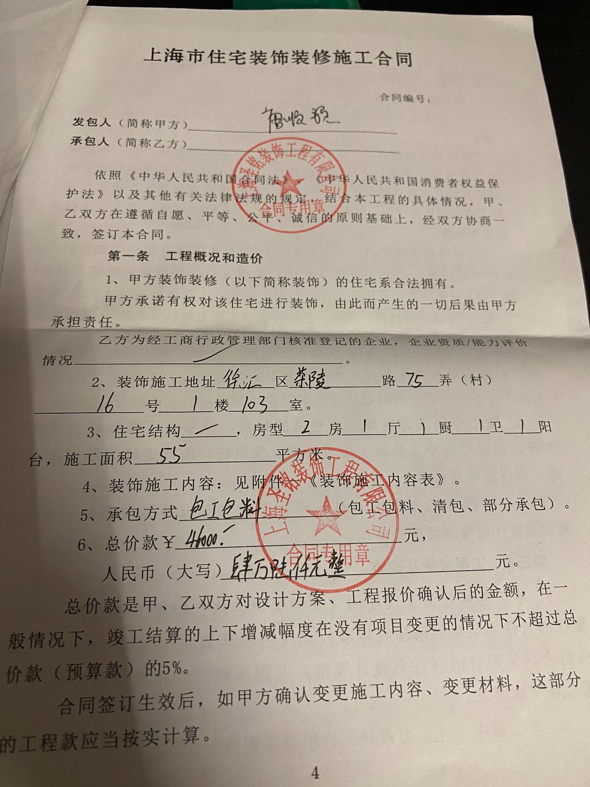 | 裝修面積 | 55m2 | 投訴人手機(jī) | 1872194**** | 被投訴人手機(jī) | 1585103**** |