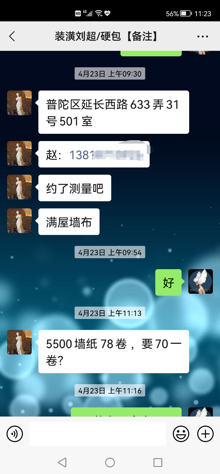 我是做墻紙壁布材料的 佳管家裝飾公司的項(xiàng)目經(jīng)理劉超和設(shè)計(jì)師劉嘉之前帶延長西路633弄31號501趙先生一家人來我店挑選墻布款式,后在4.23日劉超聯(lián)系我上門測量墻布尺寸【因劉超沒按合同幫趙先生家施工好,前面也有趙先生對他們的投訴信息】
