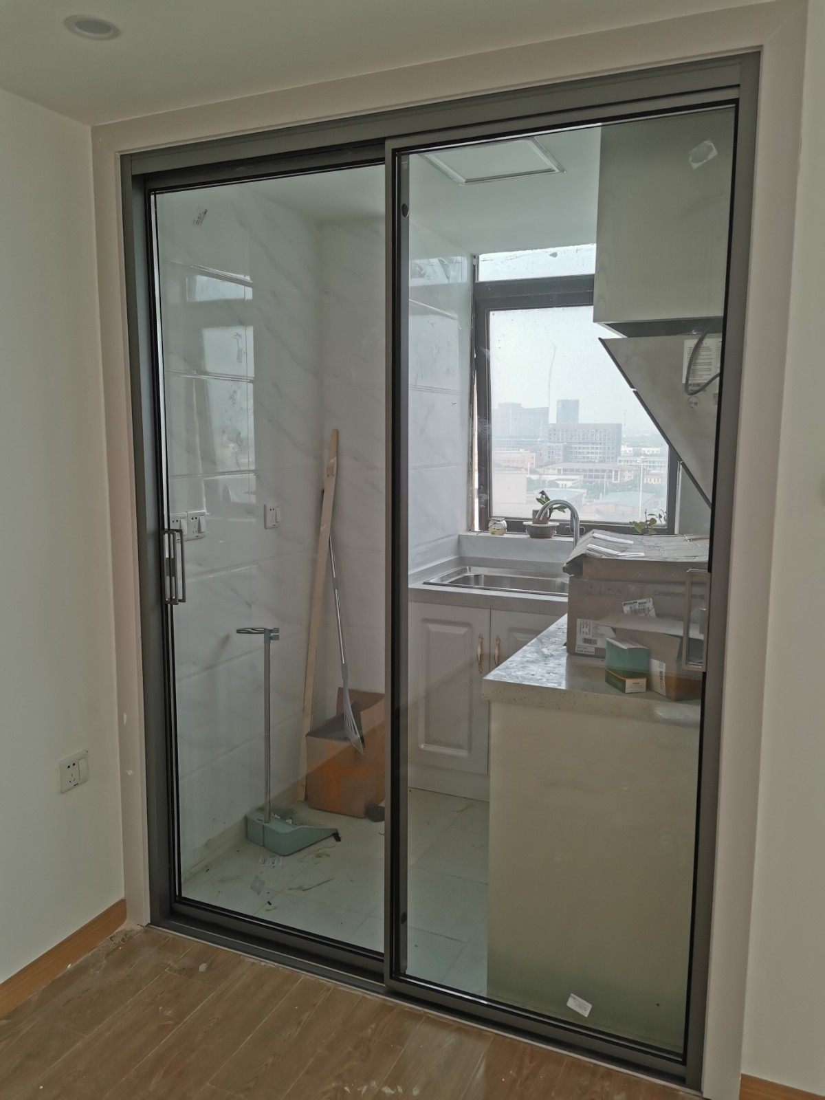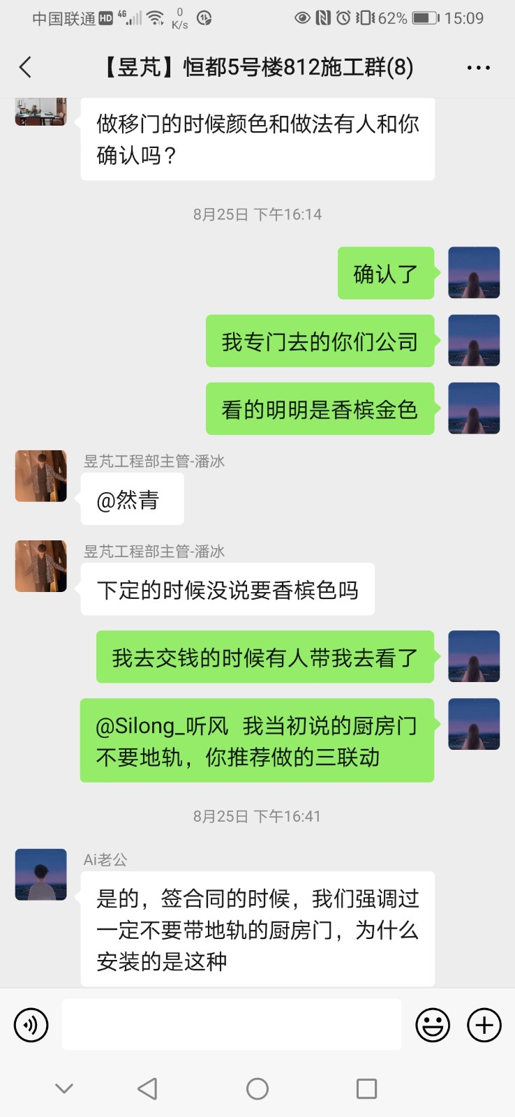 廚房三聯(lián)動(dòng)(無(wú)地軌)移門換成了兩扇門,并且不加溝通就私自安了地軌,簽合同時(shí)我跟設(shè)計(jì)師強(qiáng)調(diào)了很多遍不要地軌,設(shè)計(jì)師當(dāng)時(shí)給我們推薦的三聯(lián)動(dòng)。訂做移門之前我專門去公司現(xiàn)場(chǎng)確認(rèn)門框?yàn)橄銠壗鹕?,?shí)際施工是灰色。