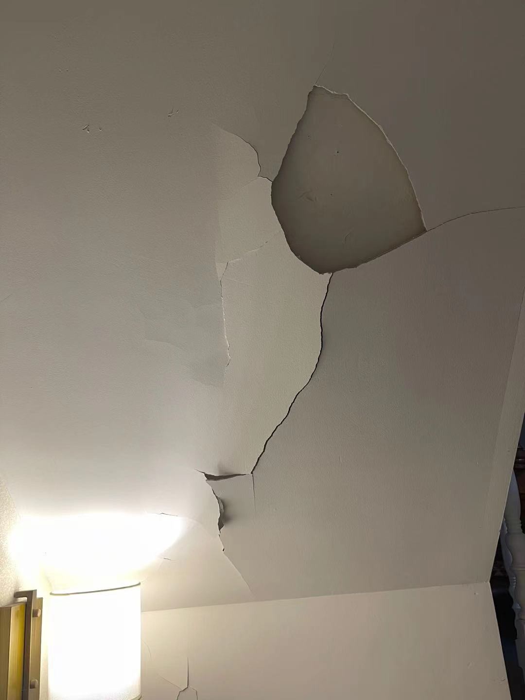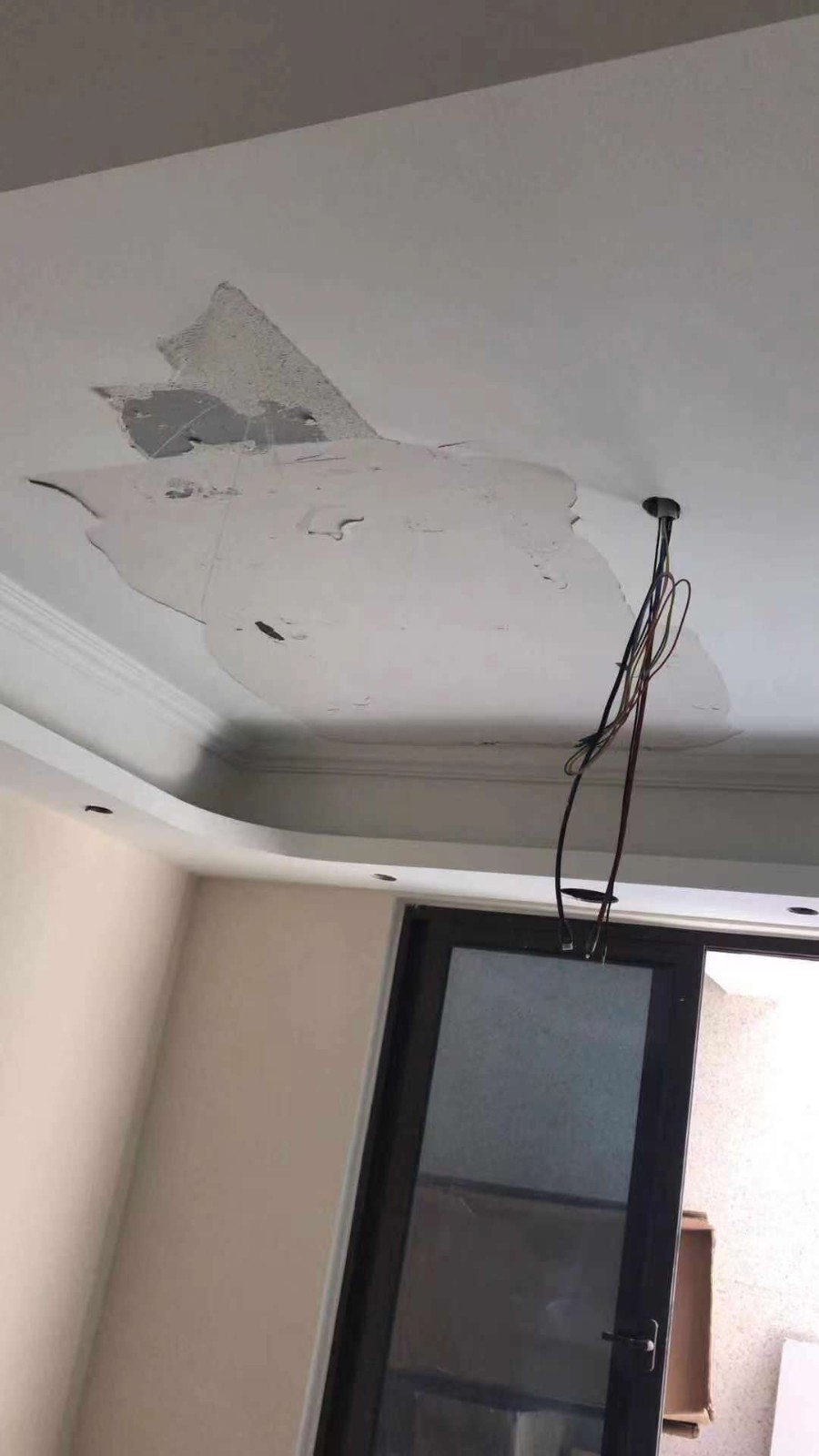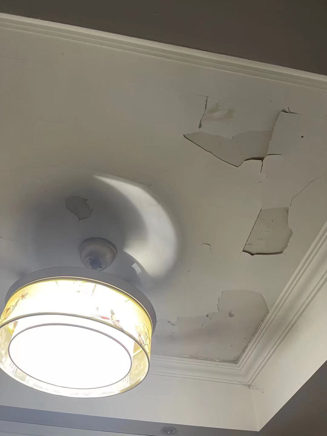 由于前面拖延工期,五月梅天的時候一般不做油漆,他們給我家做,計劃壹個月的工期,不到2周全部做好了,這個頂還沒做好,還沒到壹個月就整片的掉了,幸好下面沒人。