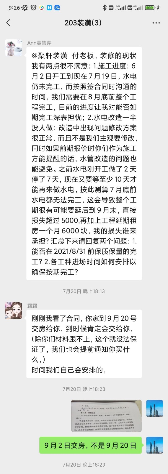 二、工程嚴重逾期,已經(jīng)逾期18天(合同約定施工時間2021/6/2-2021/9/2),但裝修公司目前仍未進場整改,木工和油漆工的工作尚未開工。逾期有四大原因: