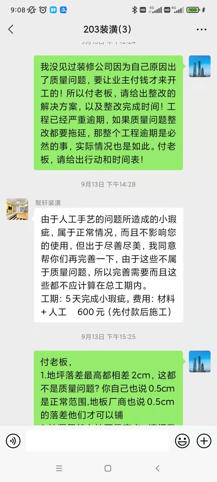 4.裝修公司不負責任,惡意延期迫使業(yè)主為自己的問題買單:出現(xiàn)質(zhì)量問題后,裝修公司居然要求業(yè)主出錢才上門整改,距離我們提出問題已經(jīng)10天,但裝修公司以業(yè)主不支付整改費用為由拒絕進場
