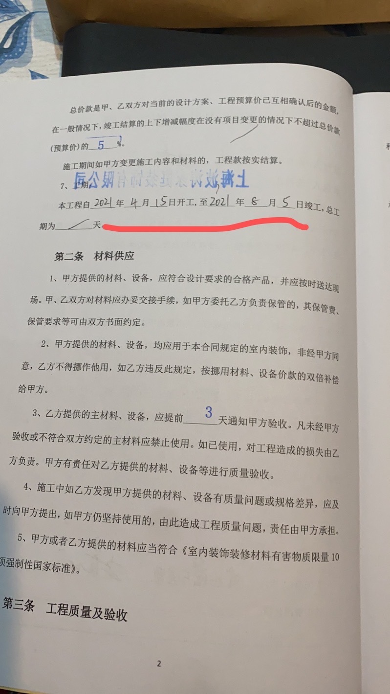 本人是在2021年4月4日與上海波濤家庭裝飾有限公司簽下24萬(wàn)(包工包料,領(lǐng)包入?。┑难b修合同。施工至今,工期無(wú)上限,費(fèi)用無(wú)上限,部分裝修還一直在返工。