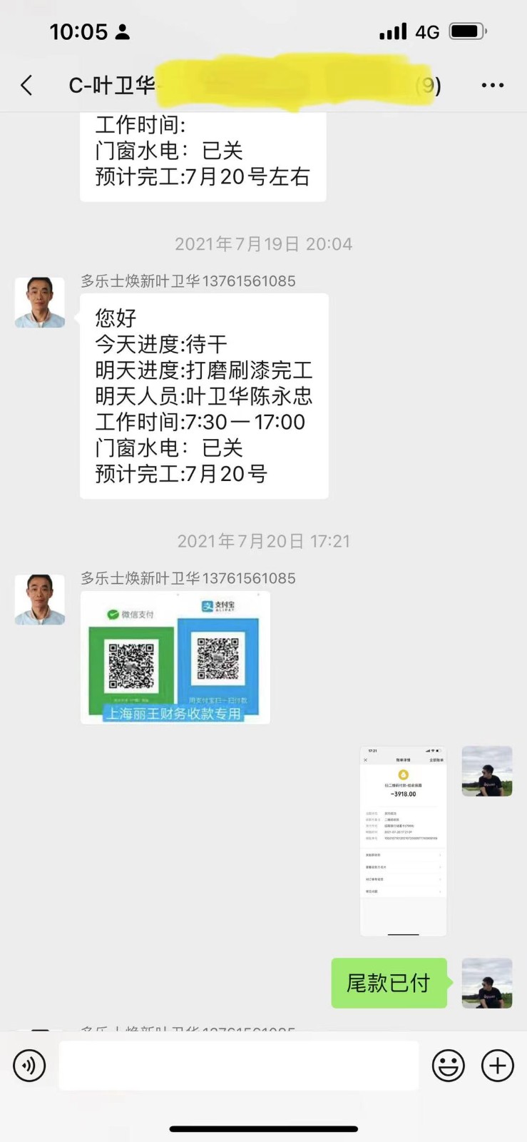 完成施工的截圖和付款截圖