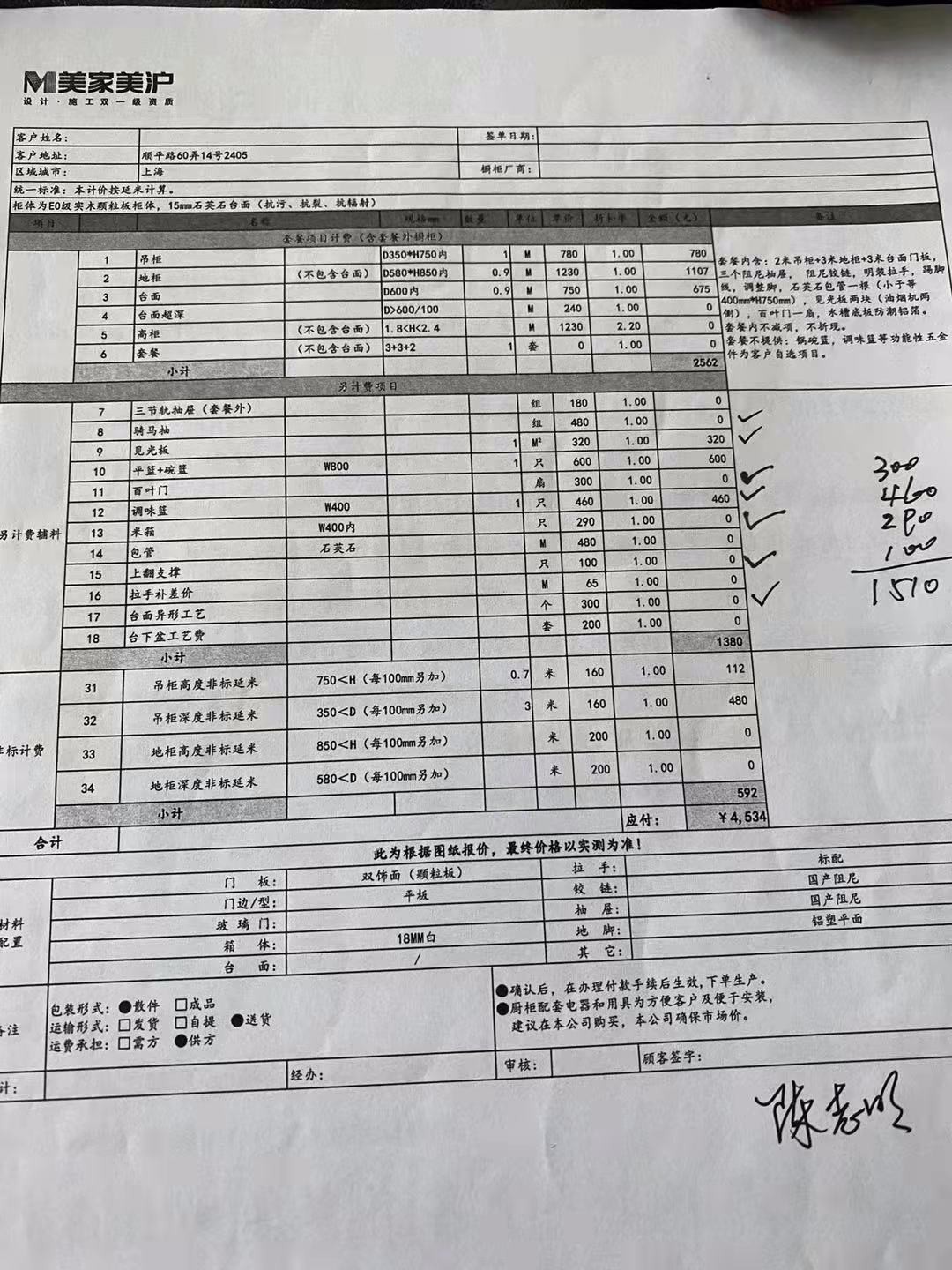 去年11月12日施工隊進場今年4月7日簽了完工單。原來我是拒簽了,他們說簽了一樣會幫我搞好。第一條裝櫥柜把我熱水器的水管打爆,他們用熱熔膠幫我?洞,我需要他們重新接管。第二條簽約時,說好吊柜和衣柜都用實木復(fù)合板做。他說可以,但要增加費用100至200一個平方,我說可以。施工時,他們說每平米要加¥600 我不同意,連他們自己都認(rèn)為貴了,所以就一直拖著沒辦法,只能讓他們用顆粒板做。我們?nèi)鮿萑后w合同簽了就是貼板上的肉。做出的衣柜上不到頂邊不到邊,做出的衣柜下面是圓形下面是方形沒有誰可以看出是什么做法來看房的人都不能理解,吊柜板上面不知什么原因多了,很多小眼和板裂。要求全部重做。
