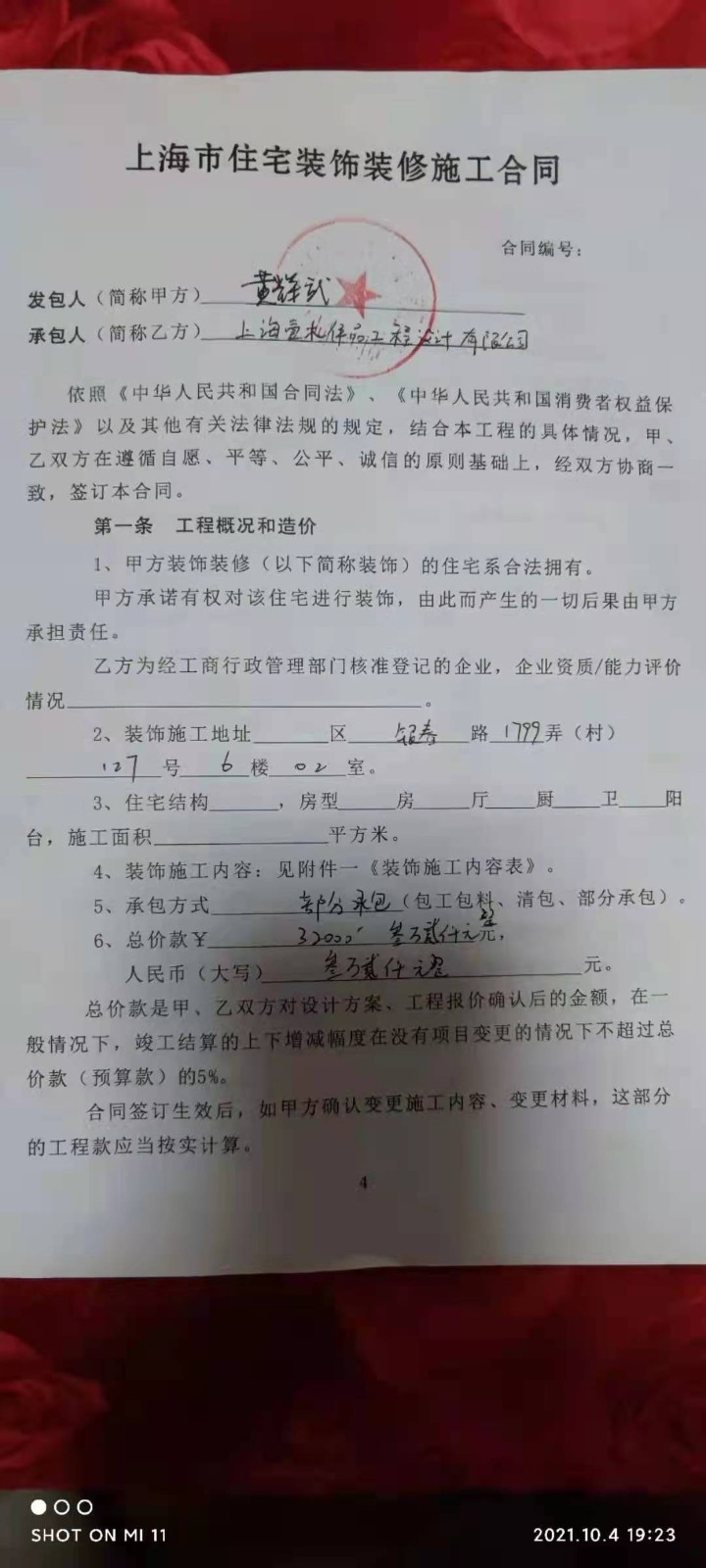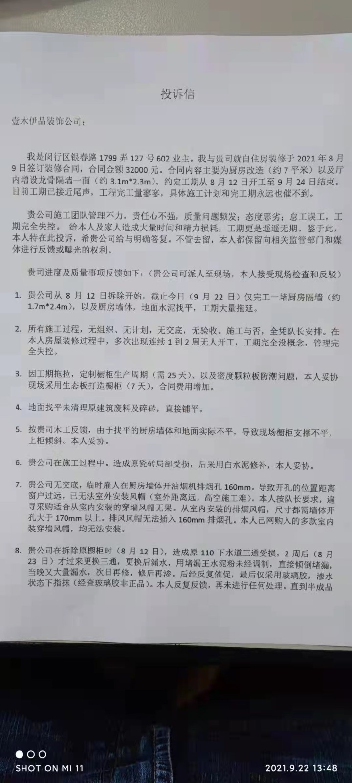 | 裝修面積 | 7m2 | 投訴人手機(jī) | 1592107**** | 被投訴人手機(jī) | 1561842**** |