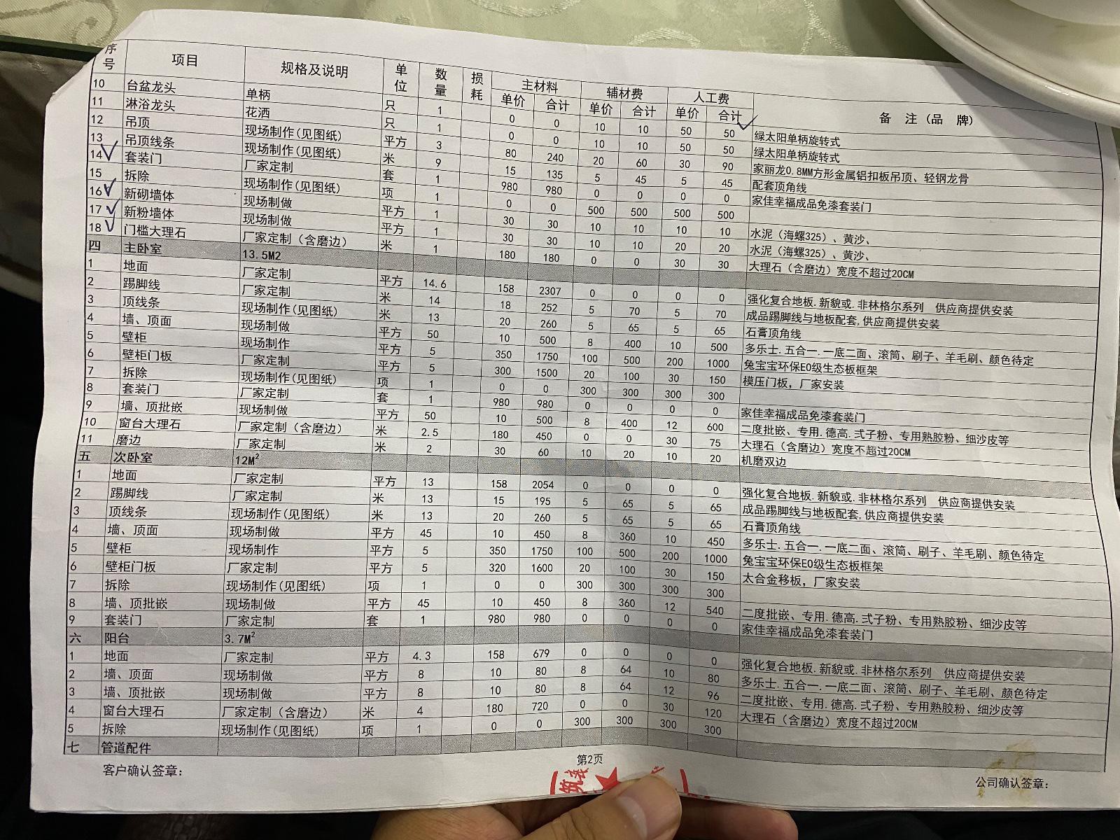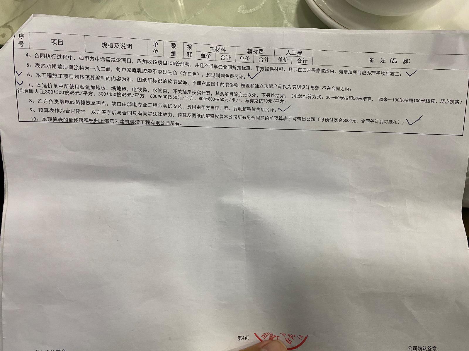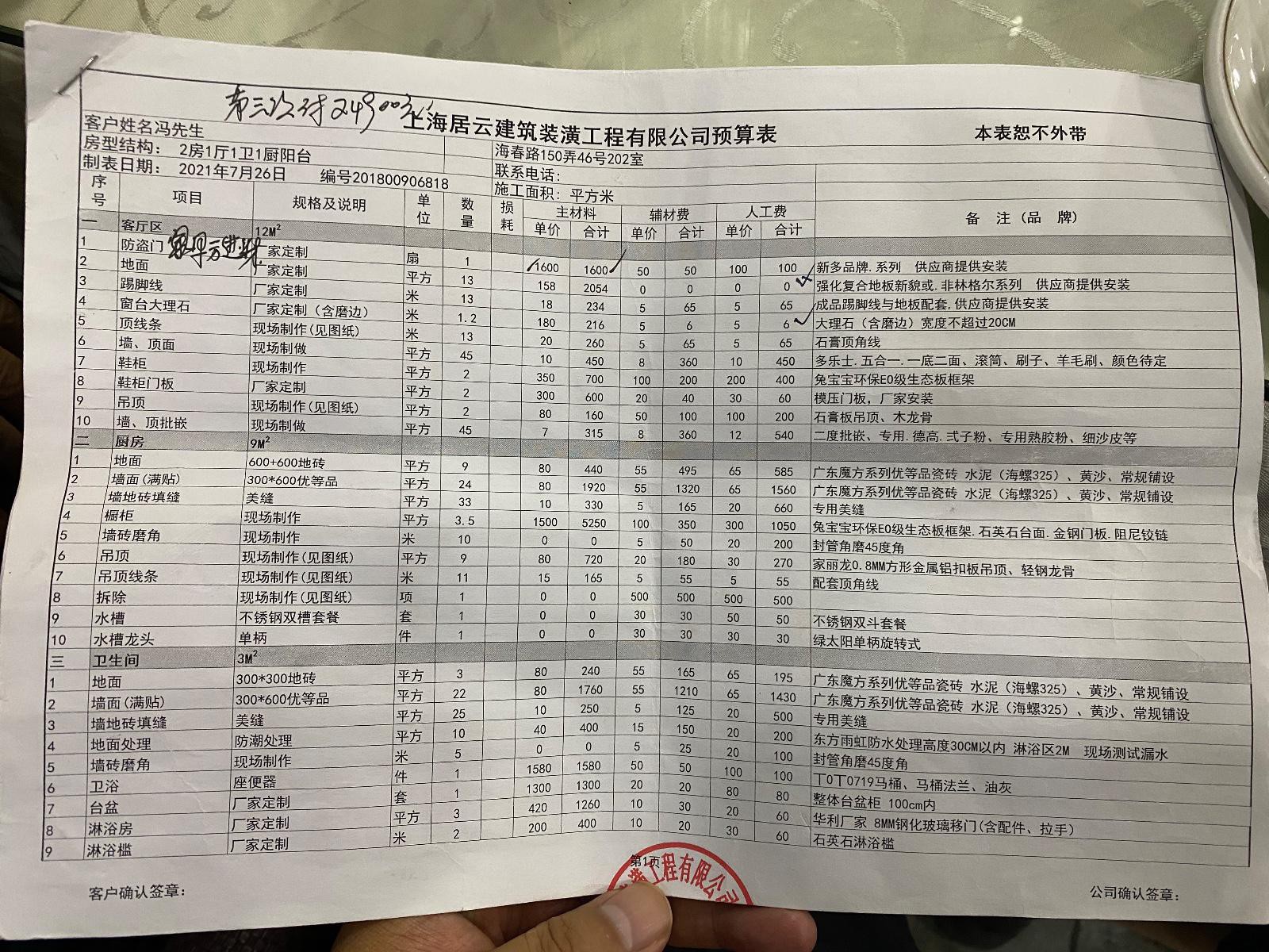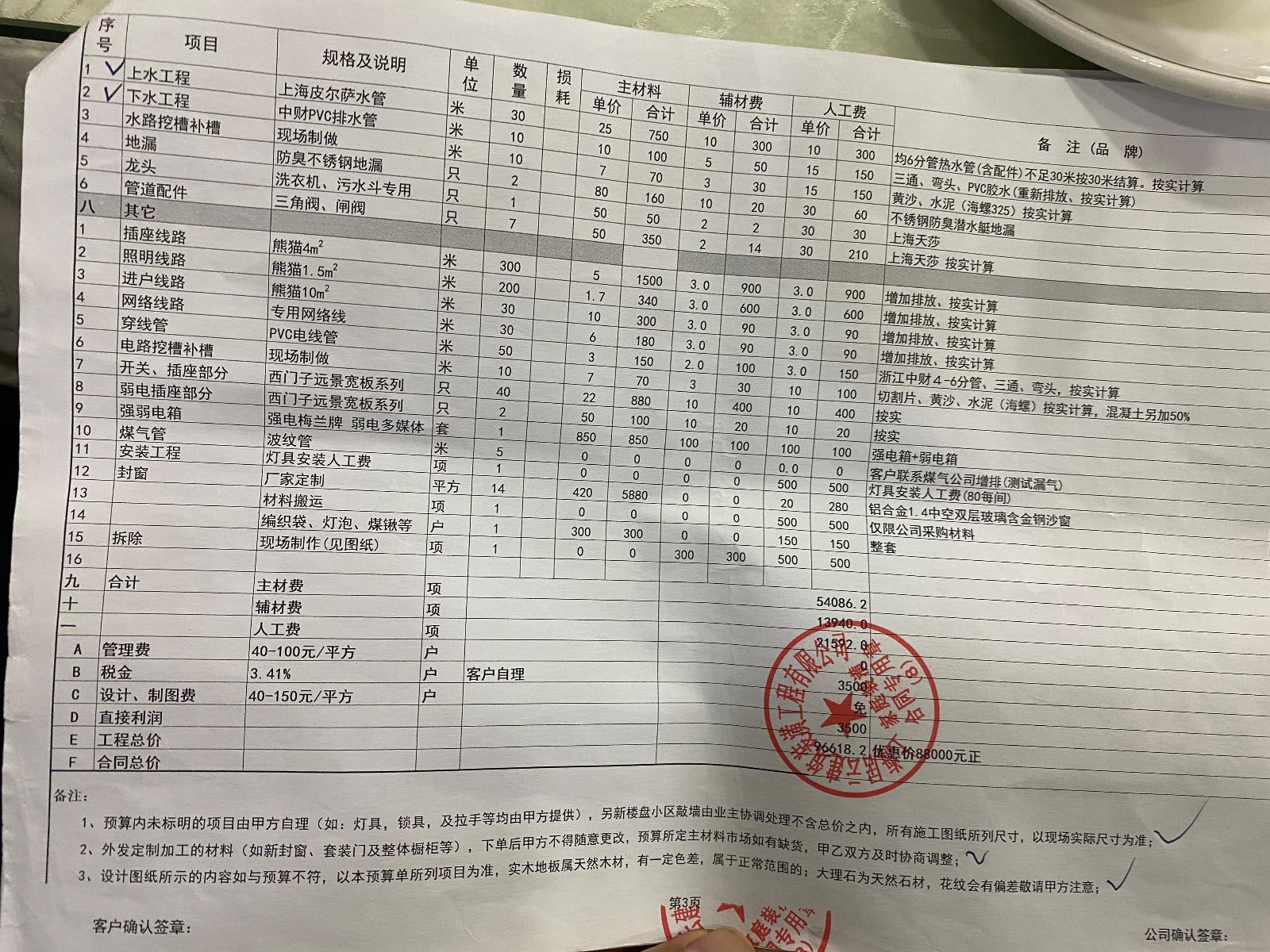 一,簽合同是我們家老人簽的,只用效果圖和一張平面圖就說按效果圖做好全部八萬八可以干。在沒有溝通施工工藝和施工圖沒畫出來之前,就讓先簽合同,老人本著相信他們的原則就同意了,簽合同時拿出來一份預算表讓隨便看了一下就讓簽了個字。后來我才知道預算表一直沒給多次催問下才給了。而且預算單上很多都是寫了一個平方的價格,