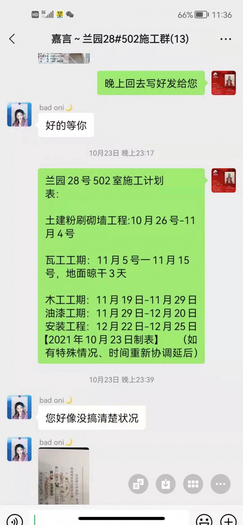 3)10.28日 我們?cè)谌豪镌儐?一項(xiàng)沒有說(shuō)清楚的款項(xiàng)收費(fèi)問題時(shí),和提前跟銷售說(shuō)過(guò)的垃圾處理方案時(shí),這次確認(rèn)下監(jiān)理知不知情,結(jié)果發(fā)現(xiàn)監(jiān)理并不知道銷售經(jīng)理黃強(qiáng)溝通過(guò)此事,監(jiān)理仍舊發(fā)了一份12.25交期的時(shí)間表,并表示木工瓦工無(wú)法同時(shí)進(jìn)場(chǎng)