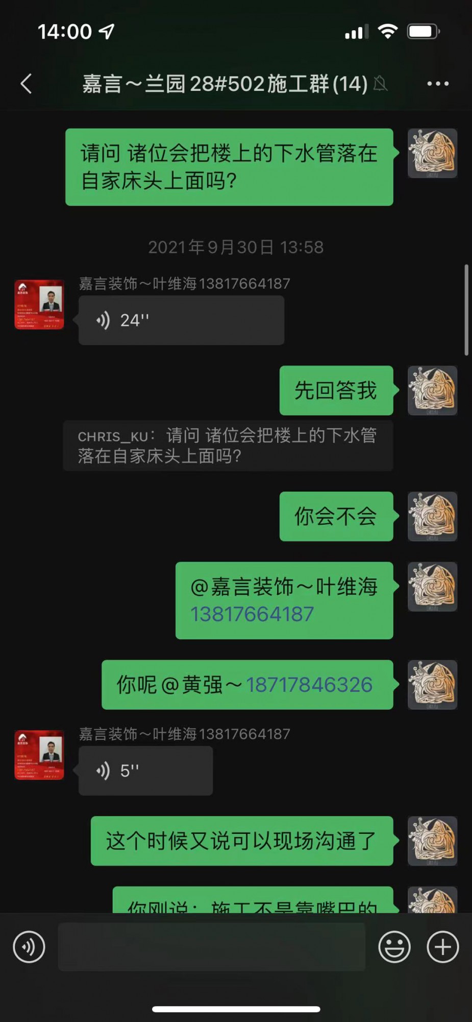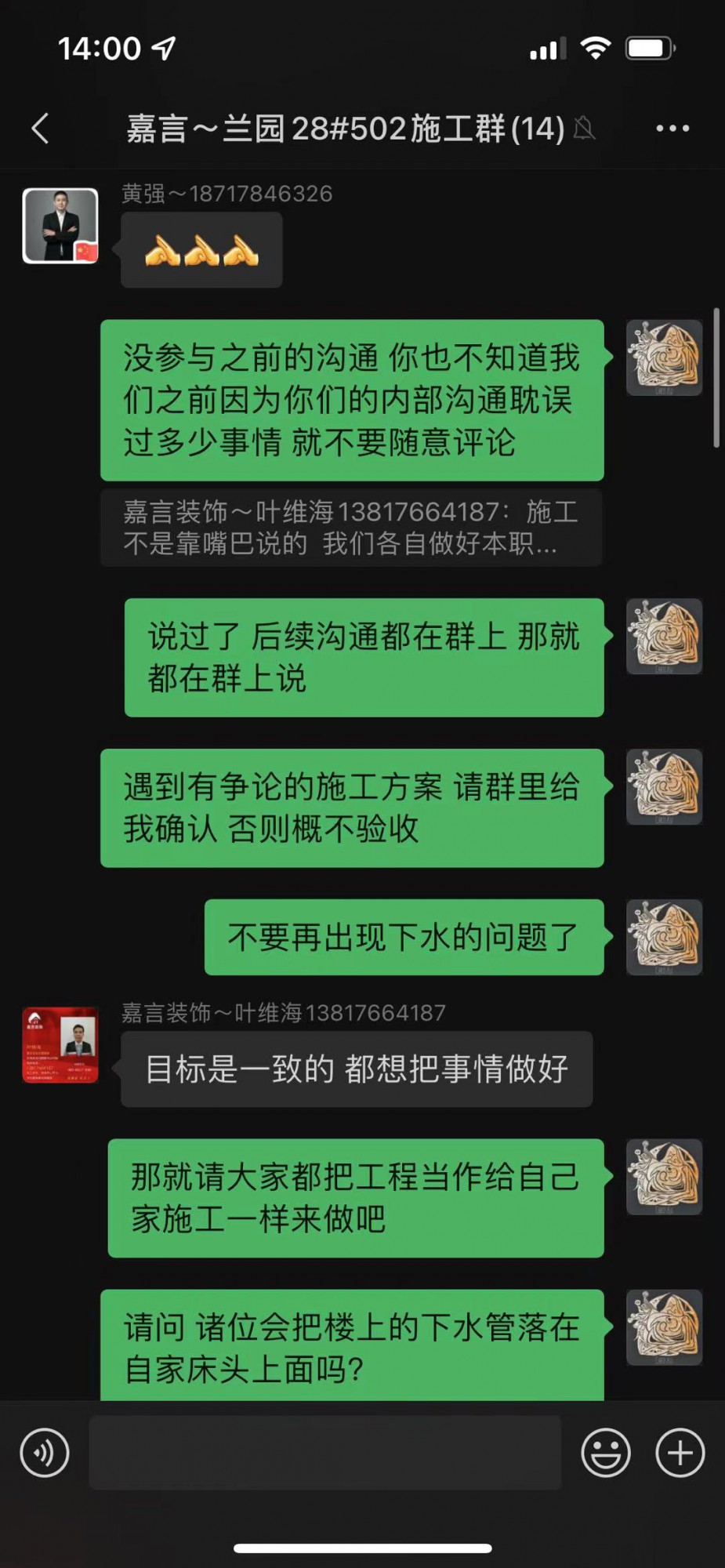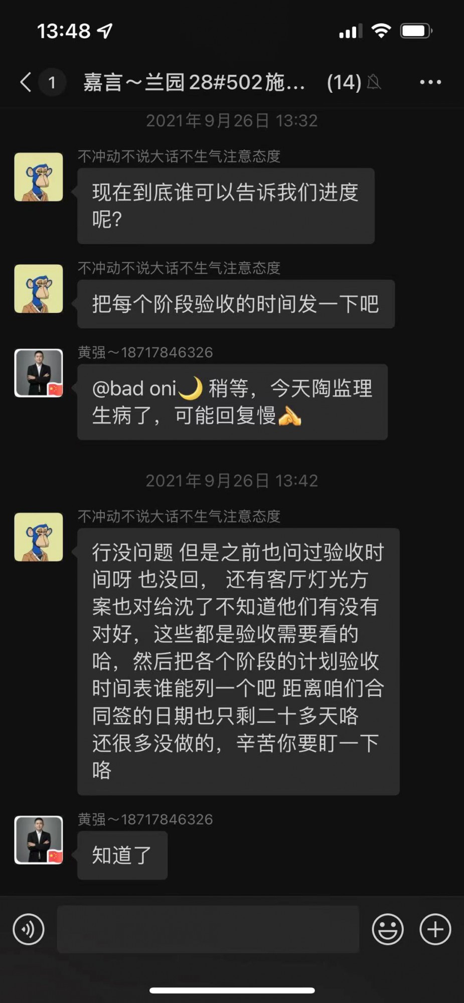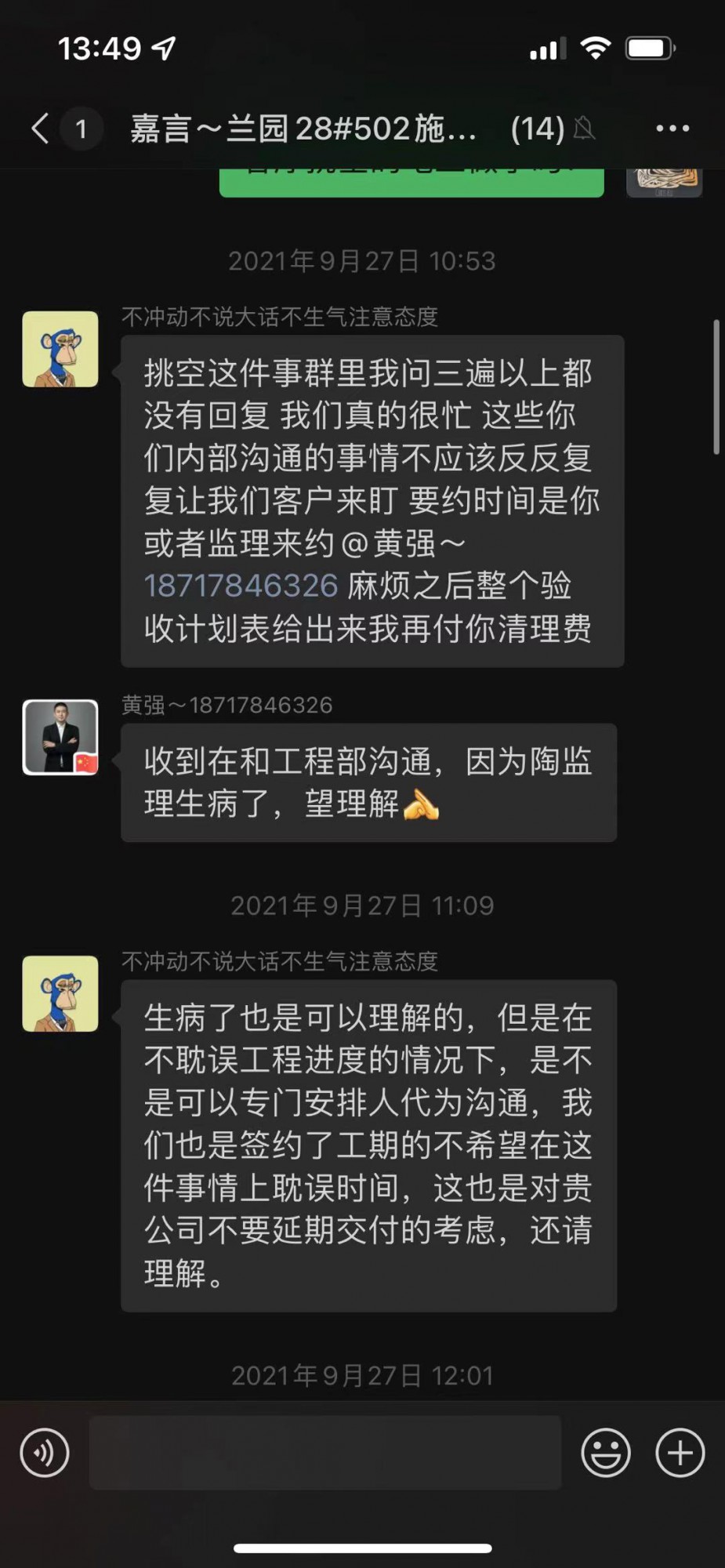 期間,業(yè)主一直在積極與嘉言溝通解決方案,但嘉言相關(guān)對(duì)接人 銷售經(jīng)理黃強(qiáng)、監(jiān)理陶繼先、工程部總監(jiān)阿銘并沒有主動(dòng)解決問題,反而一直在互相推脫責(zé)任,內(nèi)部不溝通,甚至將工程延期的責(zé)任甩鍋給到業(yè)主。至今,嘉言依然沒有給到解決方案,前后已經(jīng)更換了3位負(fù)責(zé)人來(lái)溝通,但并沒有給到解決方案。