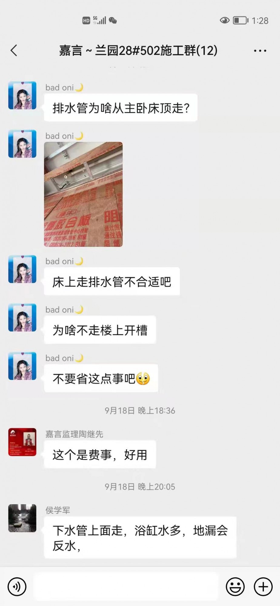 施工期間,嘉言施工進(jìn)度緩慢,在未獲得業(yè)主同意的情況下,未減少開槽工程施工量,擅自將二樓的下水管道安裝在樓下主臥床頭正上方。業(yè)主發(fā)現(xiàn)問題后,要求整改,但一直拖延未解決。期間因?qū)颖O(jiān)理生病,臨時(shí)更換監(jiān)理,但不解決施工進(jìn)度問題。