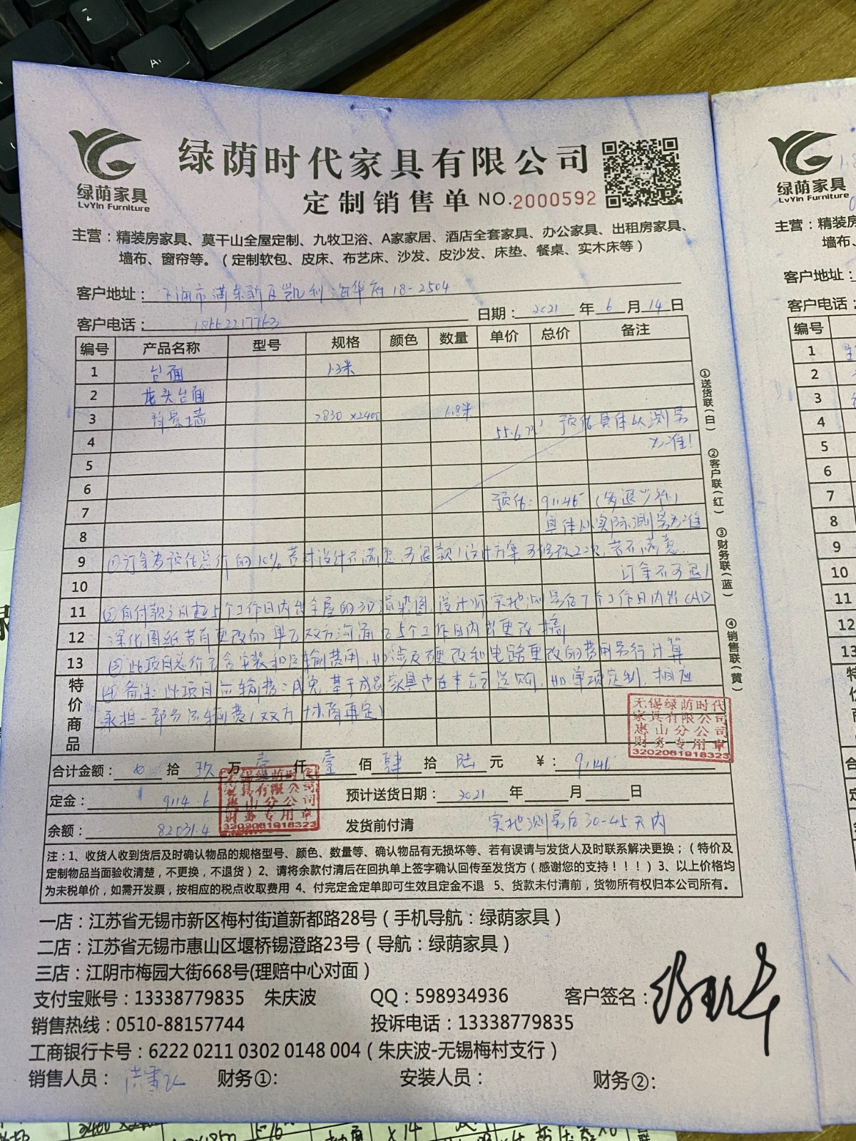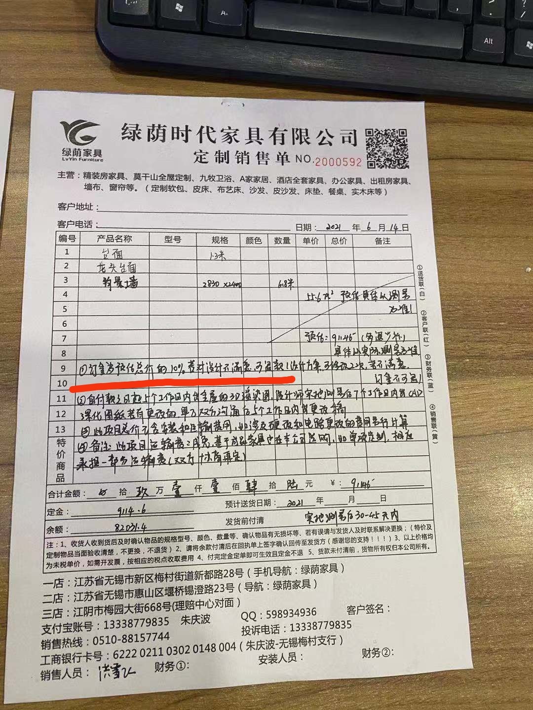 我與無(wú)錫綠蔭時(shí)代家具有限公司于2021/6/14簽訂了設(shè)計(jì)合同,并預(yù)付了估算金額的10%,即9114.6元作為訂金,就是怕后面溝通不暢或達(dá)不到點(diǎn)子上,所以約定設(shè)計(jì)不滿(mǎn)意可退款。