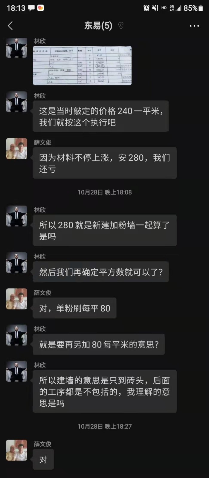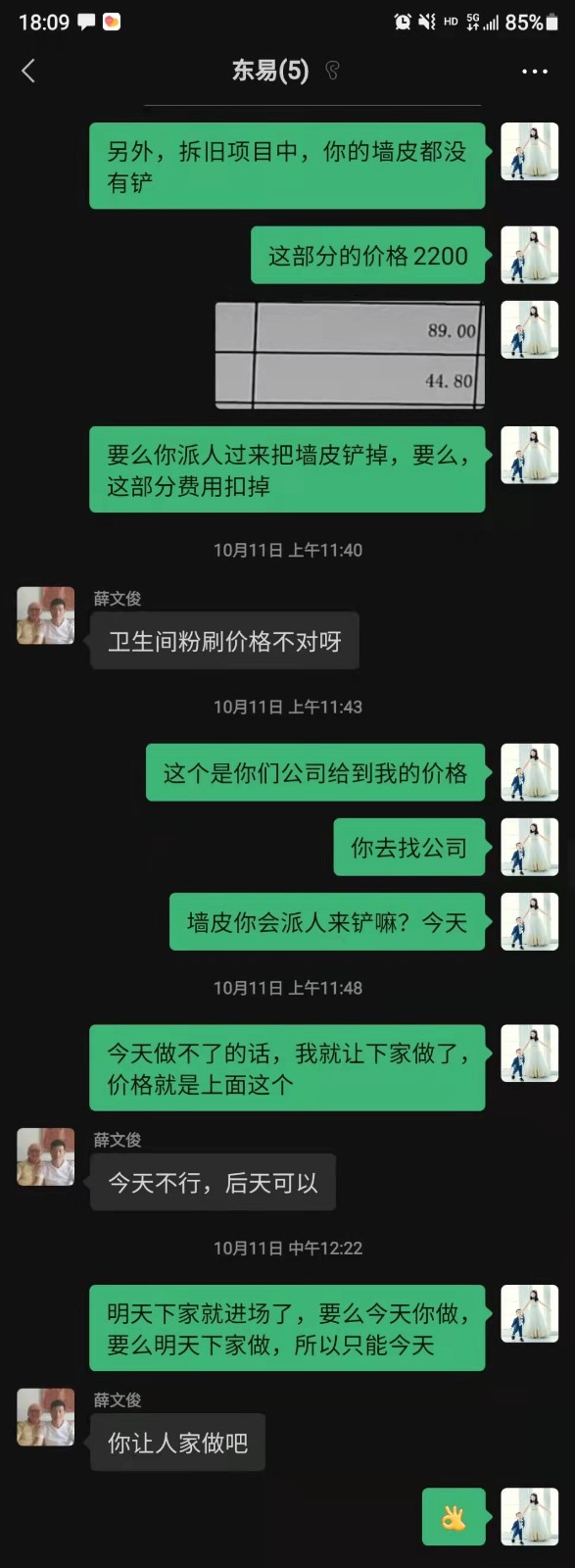 1)拆舊費(fèi)用:拆舊工作沒有完成,墻面沒有鏟除,微信溝通后,薛工同意扣除這部分費(fèi)用2200元