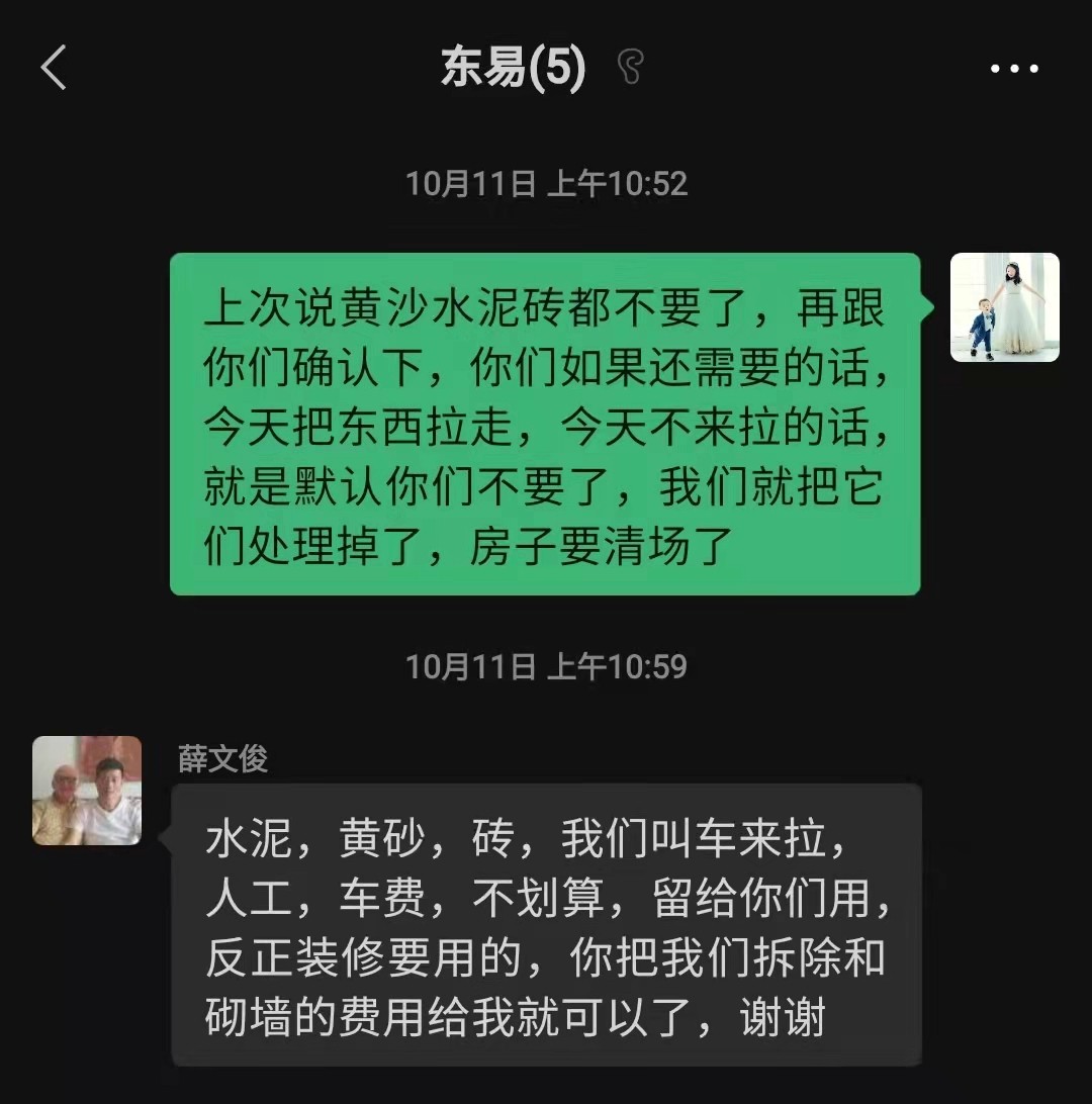 2)現(xiàn)場(chǎng)剩余材料費(fèi)用 - 水泥、黃沙、磚:終止合同后,我們有要求薛工把這些材料搬走,并且明確告訴他不會(huì)支付這些剩余材料的費(fèi)用。薛工確認(rèn)說材料由我們處理。