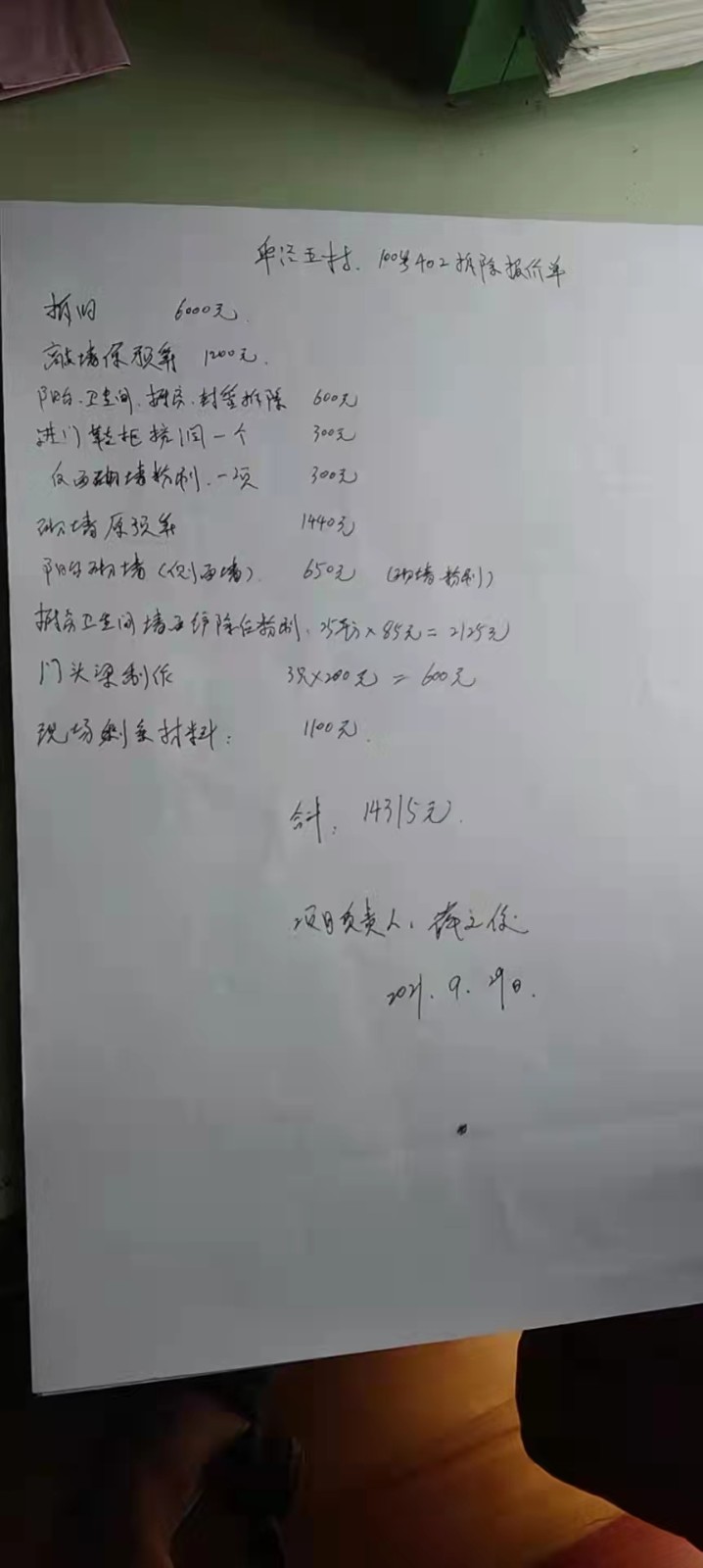 9月13日,我們與施工隊(duì)長(zhǎng)薛工、設(shè)計(jì)師,一起到裝修現(xiàn)場(chǎng)確認(rèn)前期的工程量以及相應(yīng)的費(fèi)用報(bào)價(jià)。已附上當(dāng)時(shí)的報(bào)價(jià)單