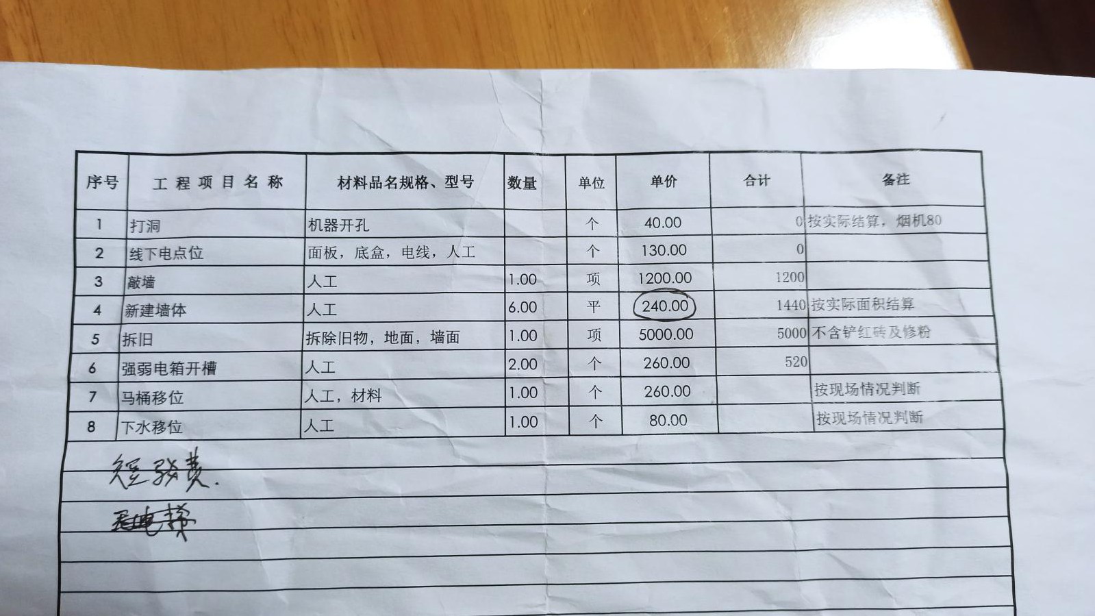9月9日,東易日盛安排了施工隊(duì)長(zhǎng)薛工與我們?cè)谒麄児疽娒妫O(shè)計(jì)師、店長(zhǎng)也都在場(chǎng),大家當(dāng)天當(dāng)場(chǎng)確認(rèn)了前期拆舊、敲墻、墻體新建、強(qiáng)弱電箱安裝的報(bào)價(jià)。