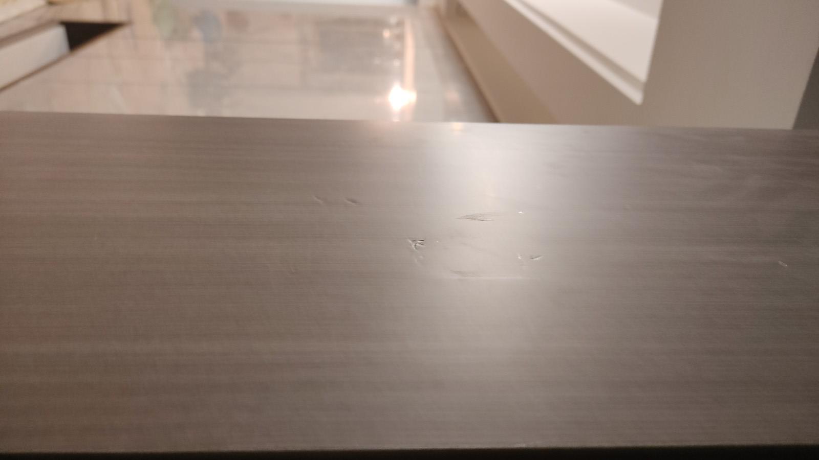 5. 木門表面因為運(yùn)輸沒有保護(hù)范圍,在木質(zhì)面和裝飾金屬條的位置都有明顯磨損,對于金屬條的修復(fù),木臣一品竟然說油漆工能處理!