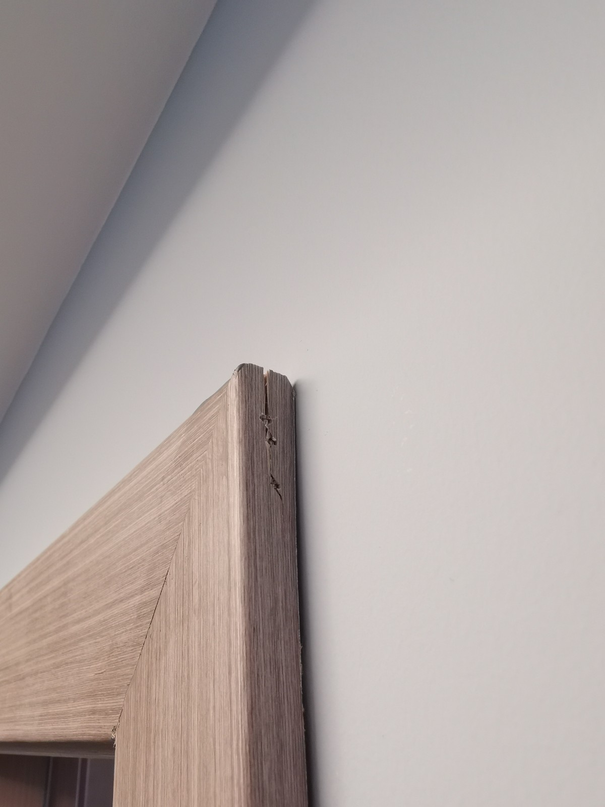 首先我家的木門門框安裝,由于木臣一品的施工人員技術(shù)不過關(guān)導(dǎo)致大量的木材破損邊緣明顯開裂以及槍釘完成的邊框拼角明顯開裂(有圖證明)