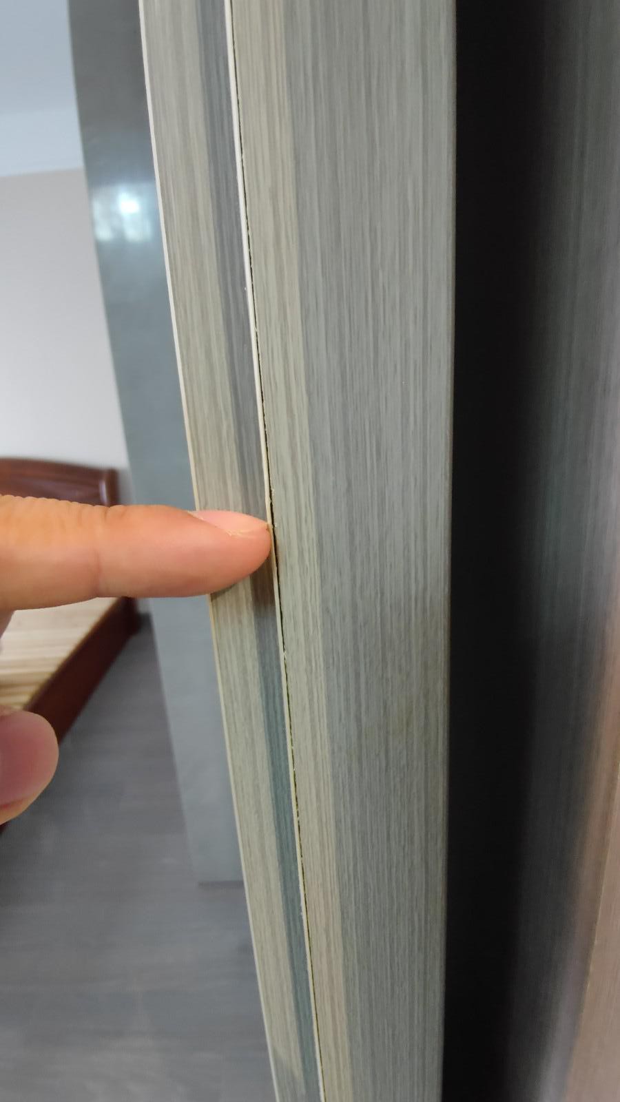 除了門框的貼皮起鼓,木臣一品提供的板材封邊(包括門扇)的封邊都出現(xiàn)了很明顯的材料殘次問題,木飾面明顯的封邊膠條突出拉手,隱形門門扇封邊明顯脫落,這些都是后期驗收實際照片和錄音有證據(jù)佐證!