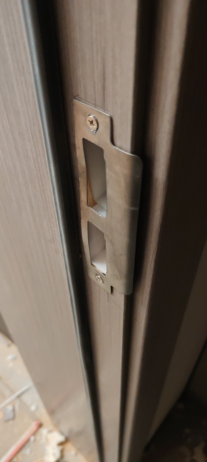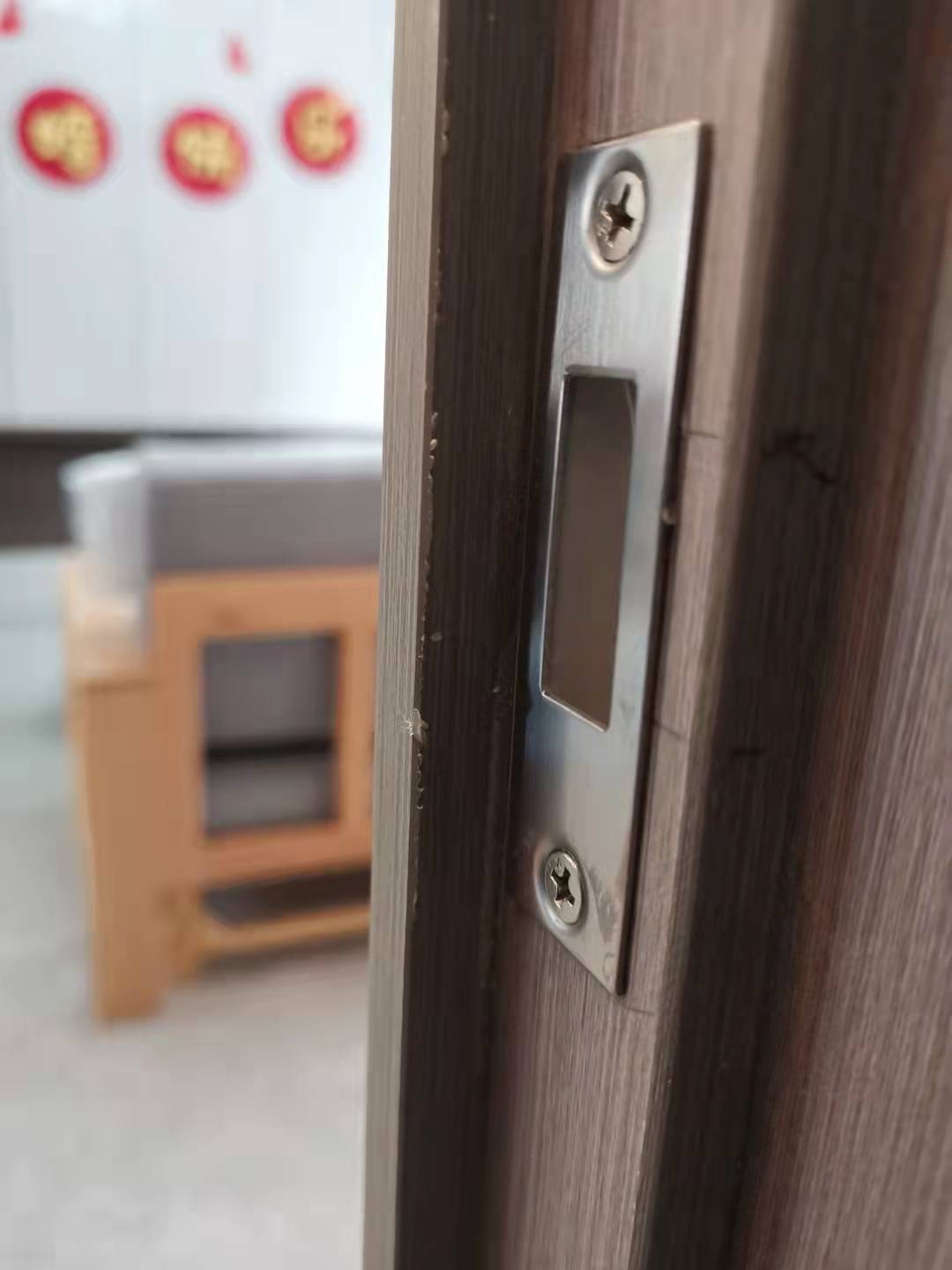 6. 門鎖無法關(guān)上,木臣一品工人暴力整改導(dǎo)致門鎖鎖舌嚴(yán)重變形!結(jié)果還是無法正常關(guān)閉!門合頁安裝不在同一垂直面,導(dǎo)致開關(guān)聲音明顯!