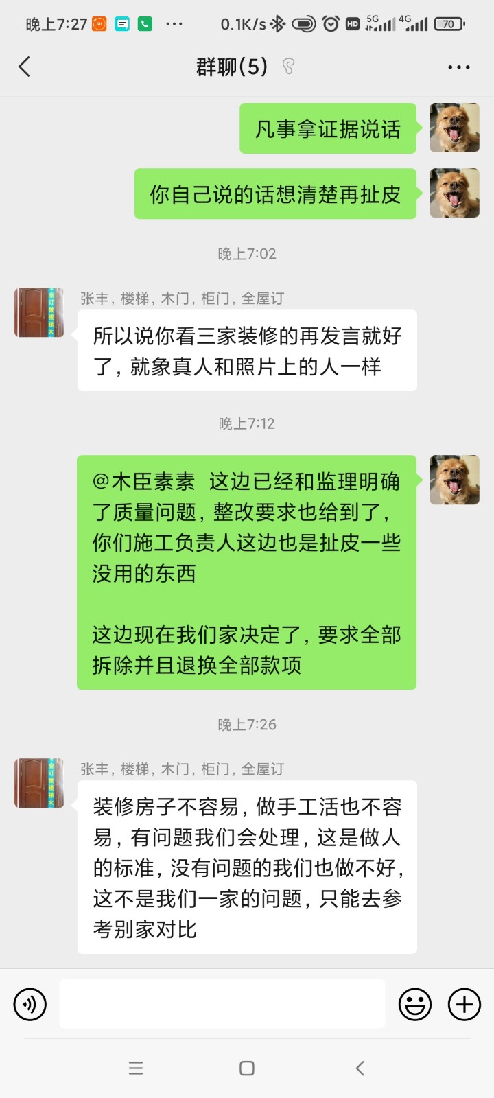 整改方案溝通,木臣一品的態(tài)度一直屬于嘴上答應(yīng)但是實際這個不用換那個不肯換!木臣一品施工負(fù)責(zé)人到現(xiàn)場對于所有問題表示都是油漆工可以來修補(bǔ)的!因此我找來專業(yè)第三方監(jiān)理進(jìn)行驗收,結(jié)果是不符合國家驗收標(biāo)準(zhǔn)!對于這個問題,木臣一品的負(fù)責(zé)人竟然文字回復(fù)是,同行都做不到,讓我對比三家(矮子里挑將軍?不符合國家標(biāo)準(zhǔn)還理直氣壯??。┑诙问悄境家黄坟?fù)責(zé)人到場,我方按照專業(yè)監(jiān)理的鑒定要求完成面以及封邊破損的地方全部更換,包括門扇破損的地方,得到的回復(fù)依舊是敷衍和只愿意更換小塊的部分,對于木飾面大塊的問題不愿意更換也不給到整體整改方案,仿佛他們覺得只要把小地方改了就沒有問題了一樣!