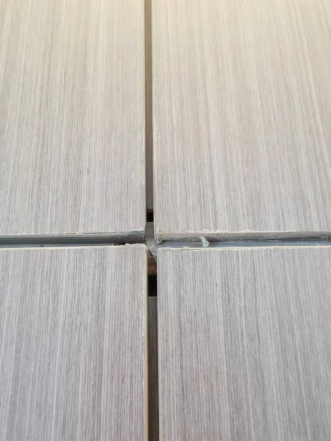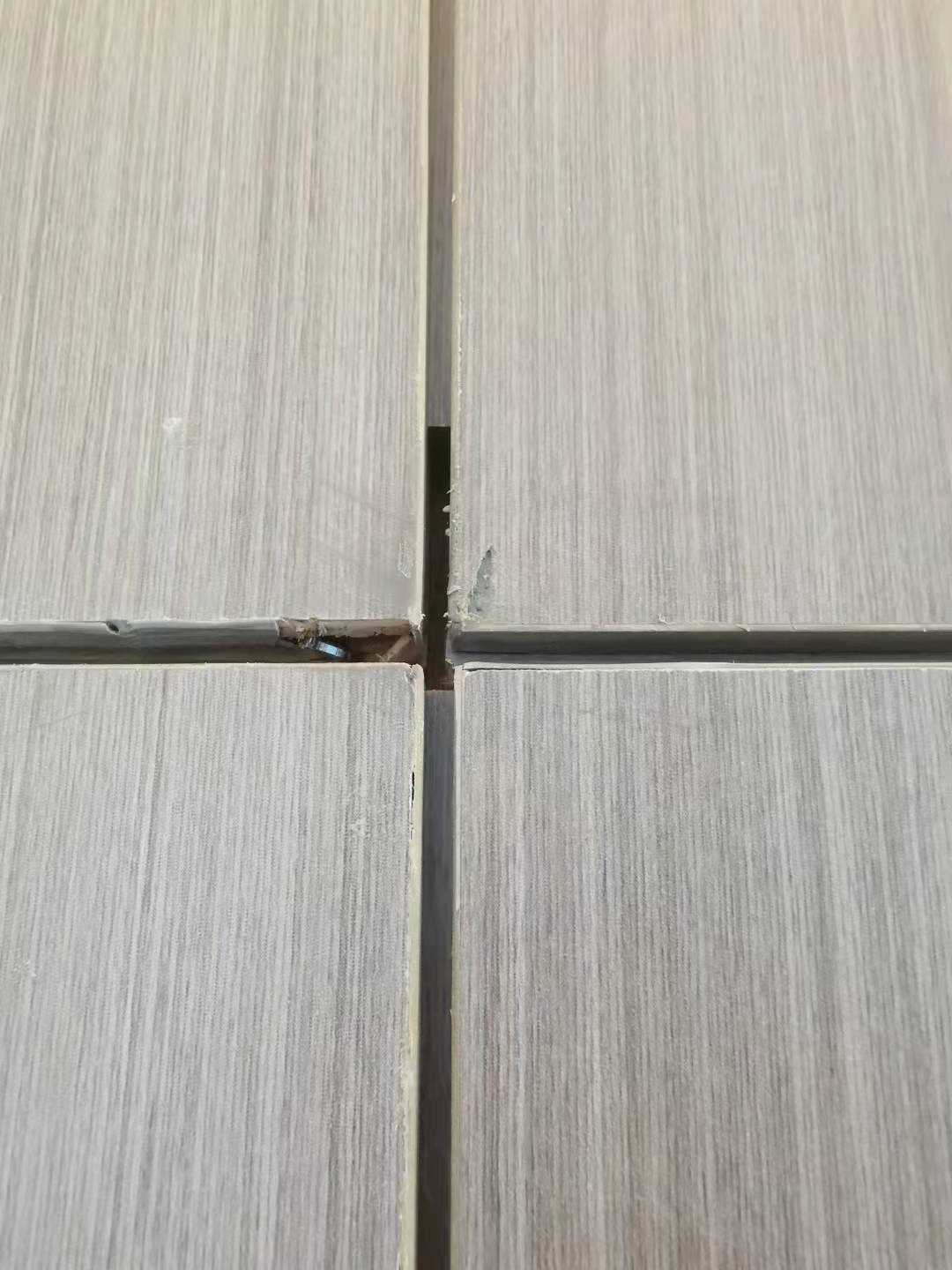 1. 木飾面十字拼接的地方幾乎全部嚴(yán)重明顯爆邊,有些爆邊已經(jīng)將近五公分封邊脫落,內(nèi)部槍釘和毛邊非常明顯