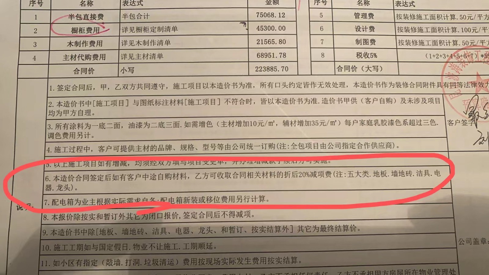 1. 合同簽訂金額為22.3萬,確認(rèn)減項(xiàng)為90,811,實(shí)際裝修費(fèi)用應(yīng)是132,189。我們已支付144,950,裝修公司應(yīng)退還12,761。但他們借故以20%的管理費(fèi)不愿退還。合同上并沒有“管理費(fèi)”一說,另報(bào)價(jià)單上只提到20%減項(xiàng)費(fèi),發(fā)生爭議后才獲知,裝修期間的減項(xiàng)從未被告知有這一項(xiàng)內(nèi)容。同時(shí),查閱報(bào)價(jià)后,發(fā)現(xiàn)減項(xiàng)僅包括地板、墻地磚、潔具、電器、龍頭五大類,而我們的實(shí)際減項(xiàng)只有墻地磚而已,與條款不符