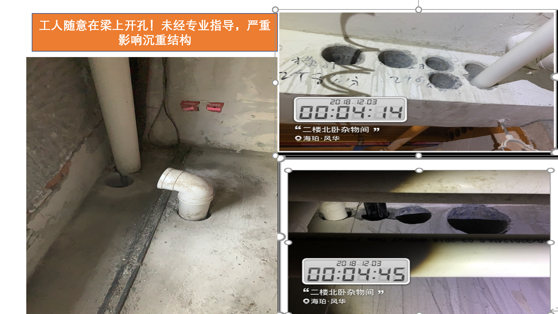 木工從馬路邊找開打洞的,不做任何結(jié)構(gòu)受力評估及事先放線,隨意在橫梁上打孔,結(jié)構(gòu)被破壞