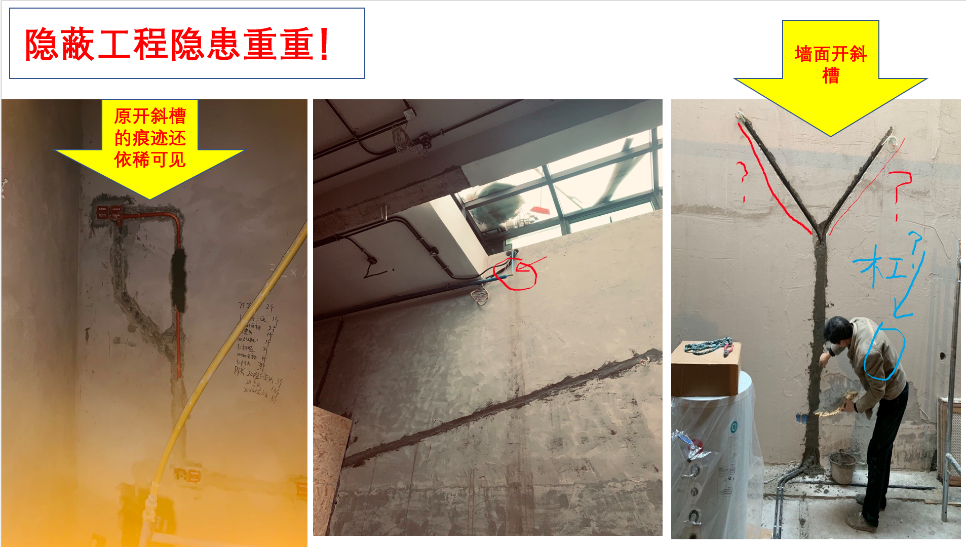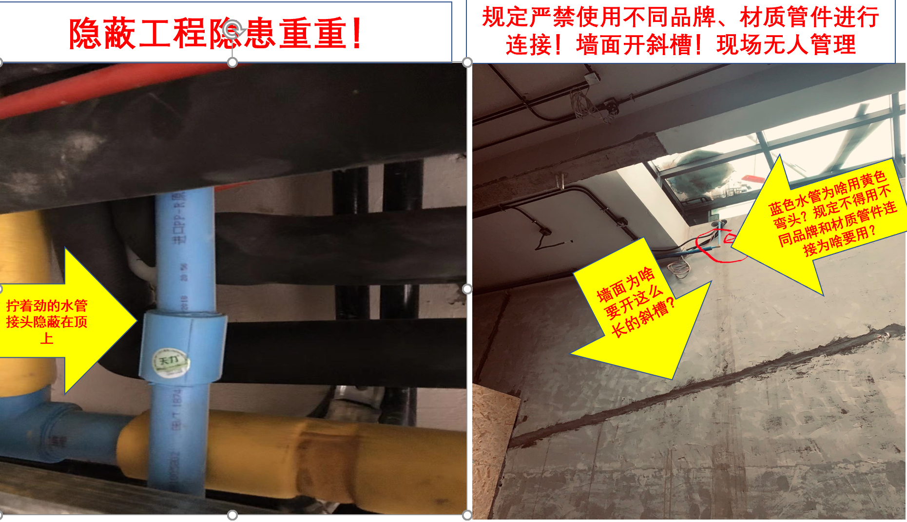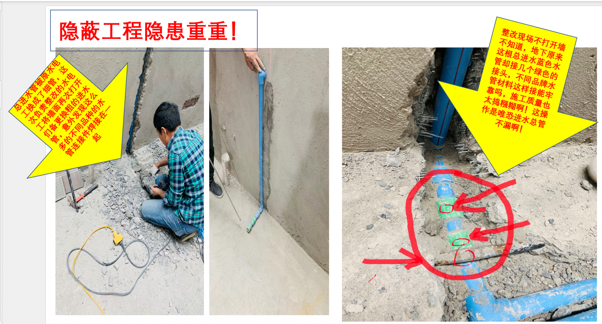 施工人員不專業(yè),水管接頭歪斜,墻面開斜槽,水管用廢管拼湊