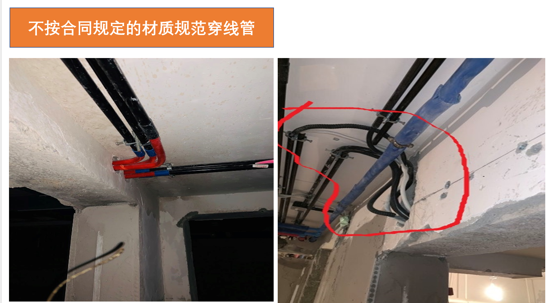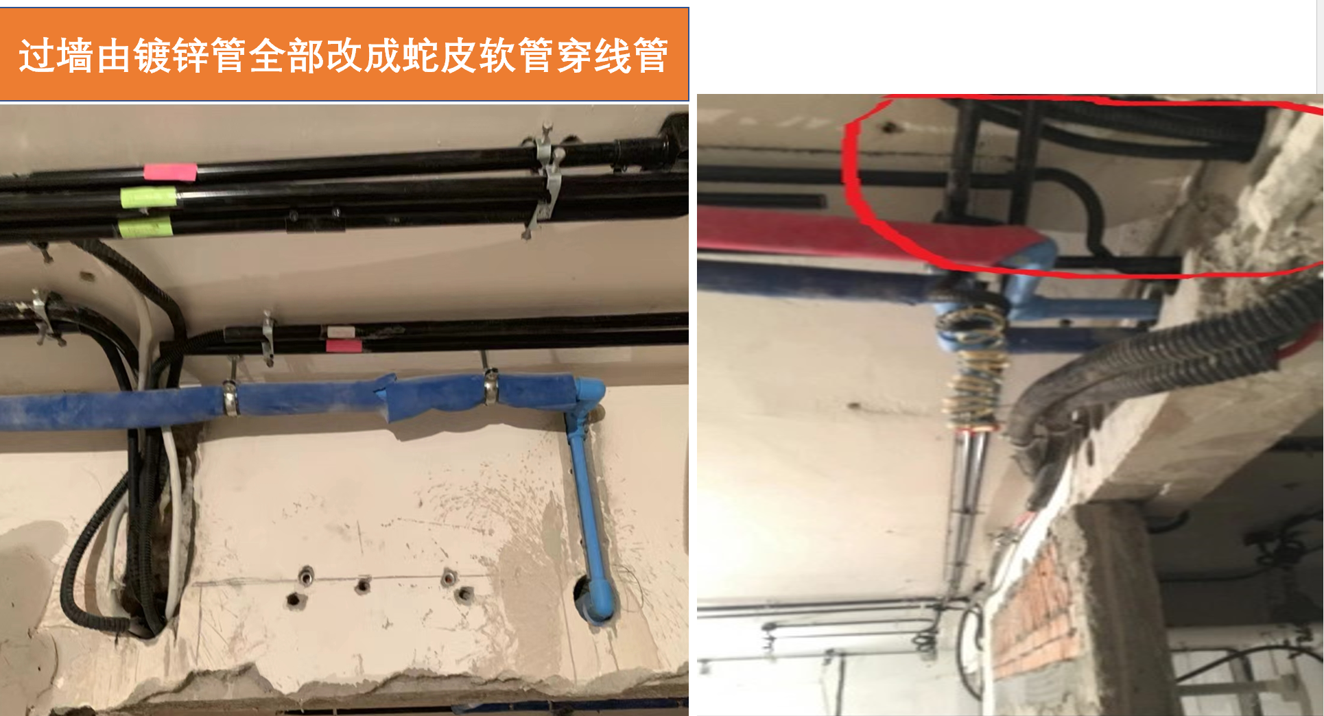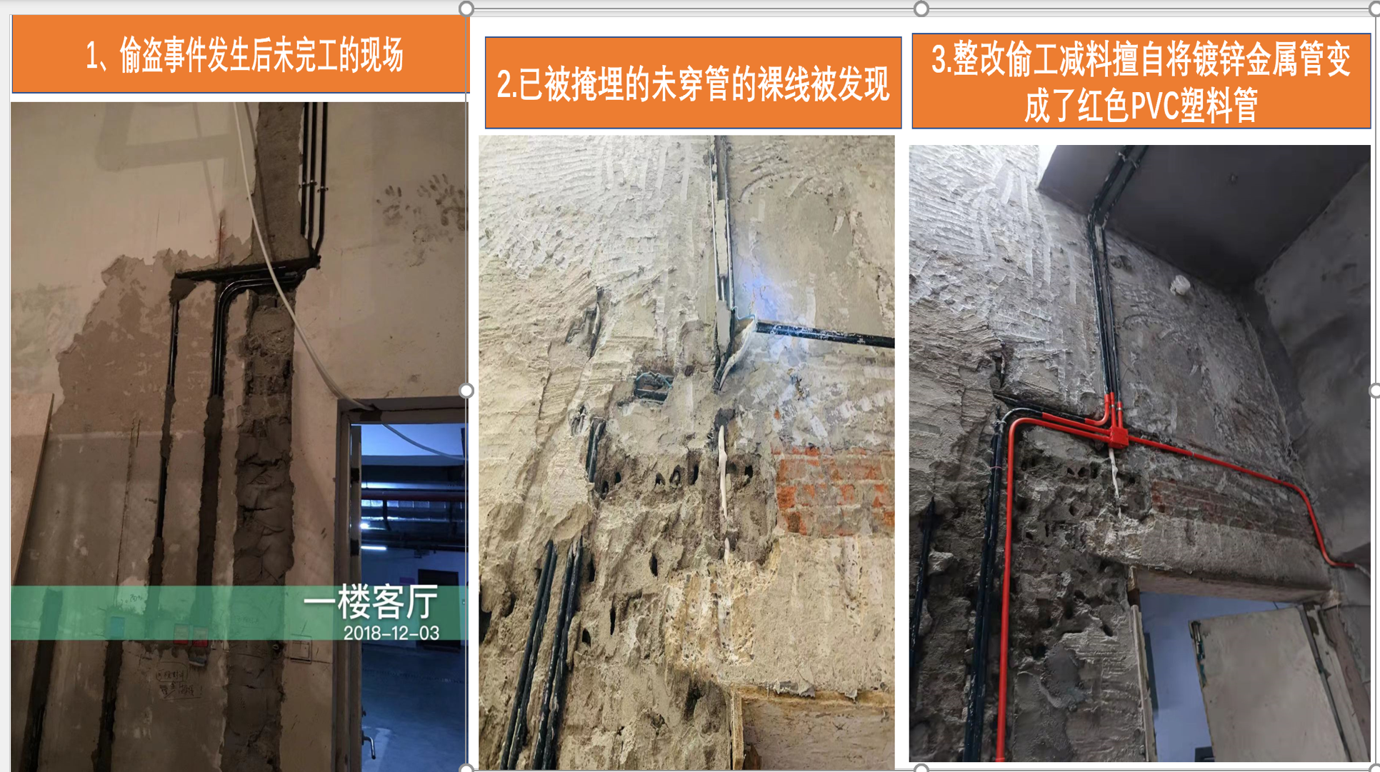 這堵墻是水電工施工時發(fā)生設(shè)備被偷盜事件后不辭而別留下的爛尾工程,鍍鋅管局部未局電線未穿管被封在墻內(nèi),業(yè)主要求整改卻采用PVC塑料管搗糨糊的