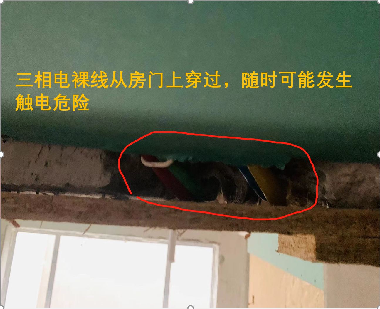這是進戶的總進線,三相電,從房門頭上裸線穿過,門套施工打釘時隨時可能發(fā)生觸電危險,續(xù)隨時可能被打穿