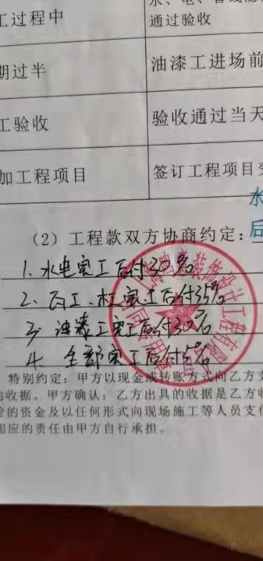 當(dāng)時(shí)沒看明白油漆工結(jié)束要求我們付款95%,可是我們簽署的全包,油漆工完工后,還有很多沒有完工的工程,比如:踢腳線、衣柜鞋柜門板、室內(nèi)的門及門套、衛(wèi)浴、灶具、水槽、開關(guān)插座、煙囪、五金件及燈具全都還沒有安裝。鍋爐煙囪打的洞打偏頂?shù)搅朔雷o(hù)網(wǎng),煙囪無法安裝,還沒有解決,對(duì)方卻說這是雞毛蒜皮的小事兒,讓我趕緊交錢。第二筆錢十幾天前剛剛付完,中間十幾天只刷了個(gè)漆就又要我交到95%,幾乎繳全款,但很多東西沒有安裝,我認(rèn)為不合理。且油漆質(zhì)量未能保證,多處出現(xiàn)斑點(diǎn),未刷均勻。