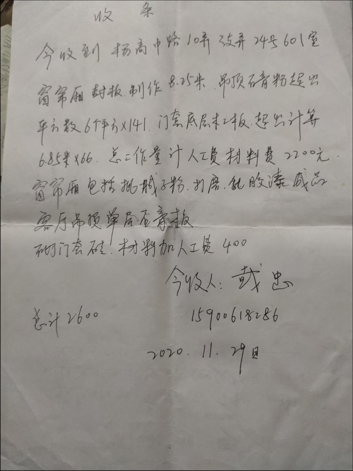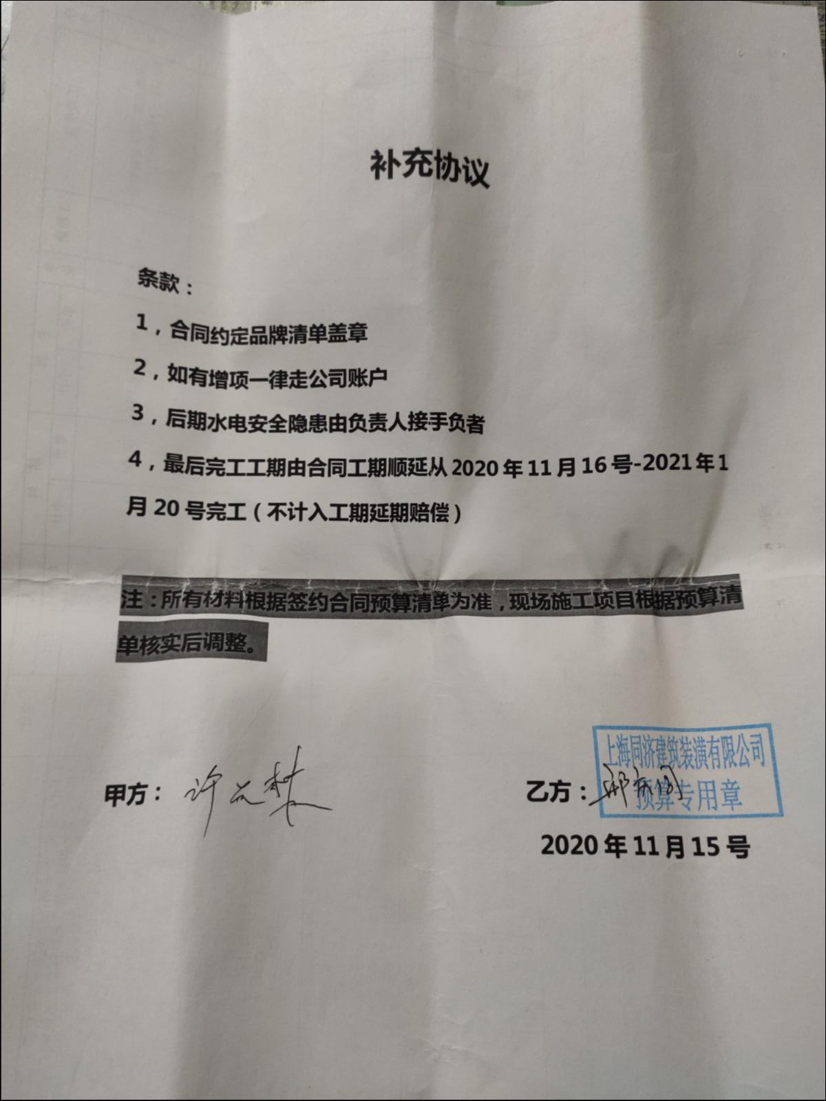 由于同濟(jì)公司耍無(wú)賴(lài),勒索現(xiàn)金,無(wú)證施工,水電整改一直拖延,做錯(cuò),未完成,于11月15號(hào),自稱(chēng)工程部經(jīng)理邢慶同與我們簽訂合同補(bǔ)充協(xié)議,完工日期約定為2020年11月16日至2021年1月20日,并且所有金錢(qián)走公司賬戶(hù)。