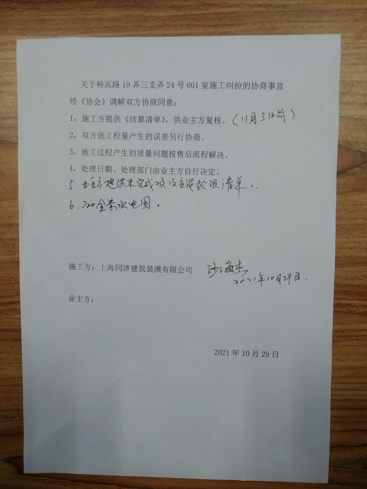 從2020年11月開(kāi)始,6次前往古北路1699號(hào)上海裝飾裝修協(xié)會(huì)舉報(bào)未解決。2021年10月29號(hào),項(xiàng)目經(jīng)理沙海杰在協(xié)會(huì)專(zhuān)家韓某面前,親口承認(rèn)監(jiān)理孫躍和水電工瞿華國(guó)都沒(méi)有證,并簽名11月5日把清單,隱蔽工程圖紙等交給協(xié)會(huì)解決,至今未給。