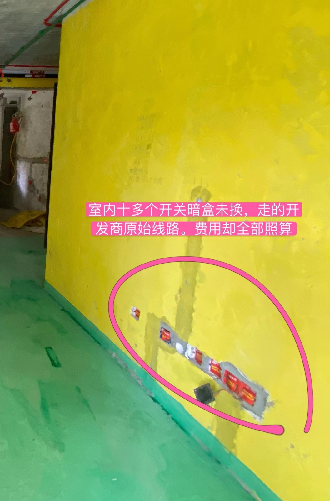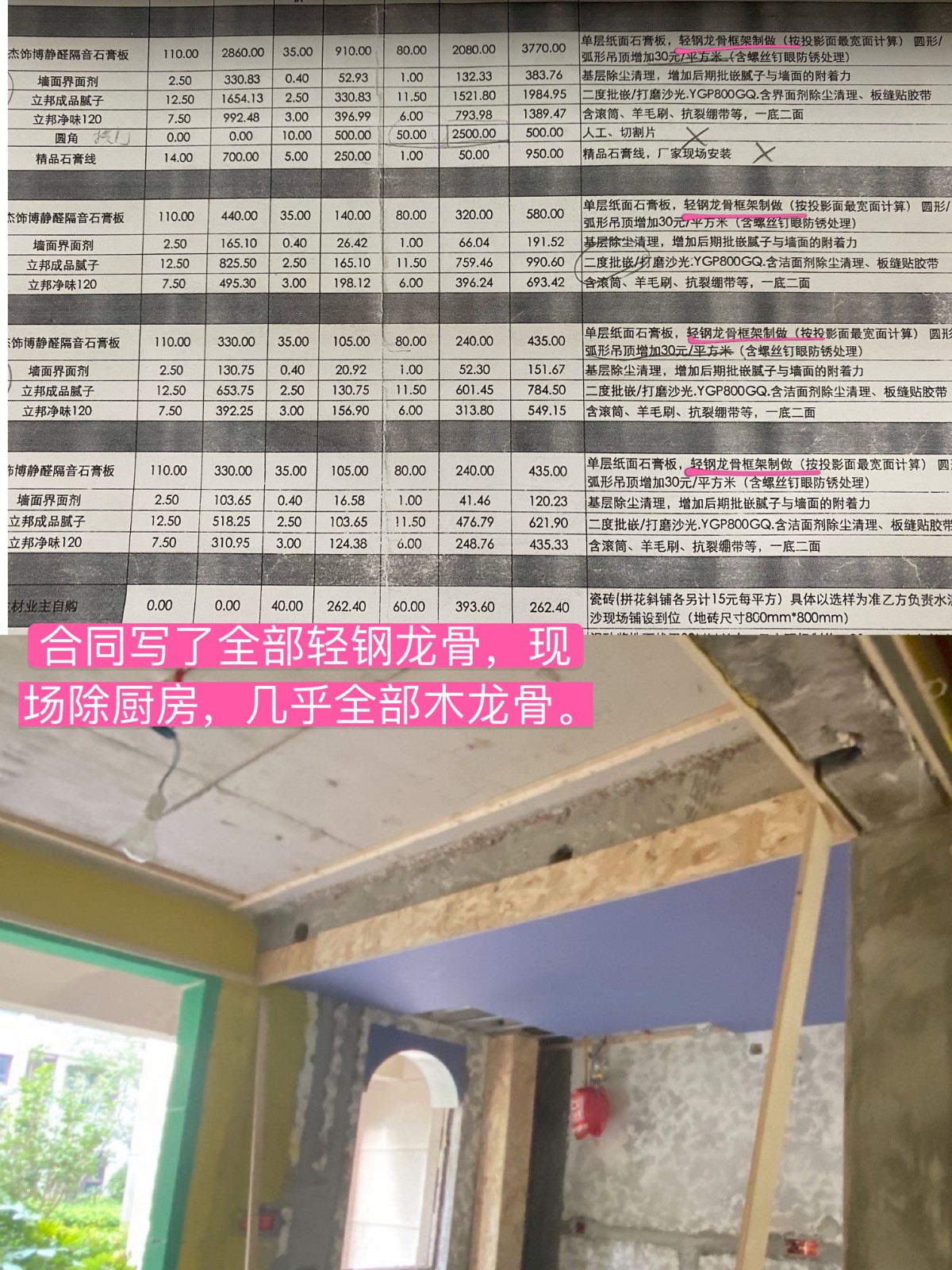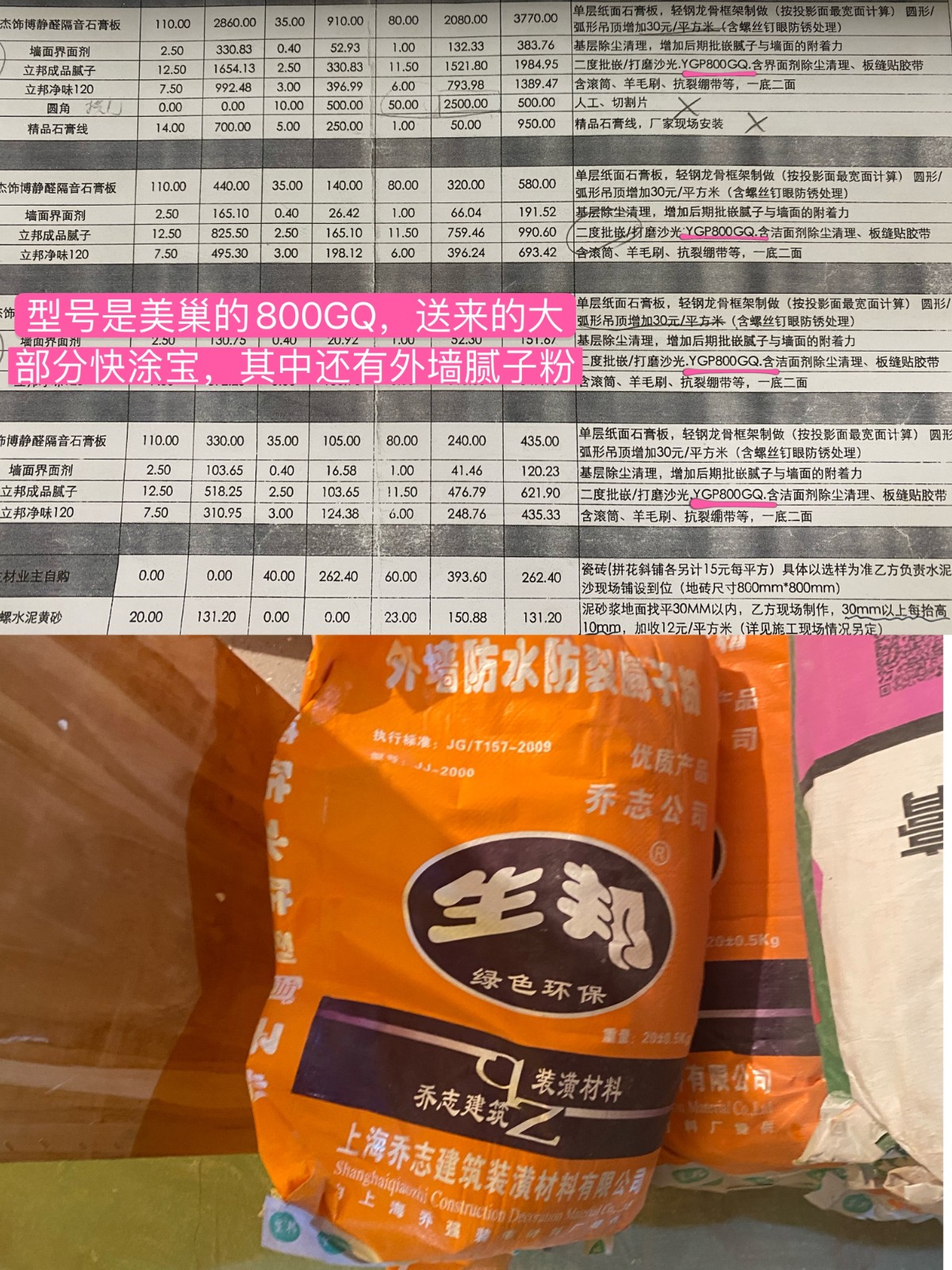 二、整個裝修過程中,裝修公司多個項目偷工減料。目前本人能明顯察覺到的就有3處:(1)電工階段十多個暗盒未更換,仍然走開發(fā)商布置的原始路線。在8.6水電驗收時提出的更換暗盒等操作,一直沒有處理,并且仍然按預算收取74個暗盒安裝費用。(2)木工階段全屋吊頂基本使用木龍骨,包括中央空調(diào)安置的所有過道區(qū)域、客餐廳、書房、陽臺區(qū)域。而按照合同,該公司的預算詳情說明中,明確表示他們使用全屋“輕鋼龍骨框架制作”,且在9.13致電設計師時,設計師張曉旭也明確表示除弧形、圓形等不規(guī)則造型外,他們公司是“全部使用輕鋼龍骨制作”的。(3)油漆階段。由于合同預算的不規(guī)范,設計師在備注中寫的型號為美巢YGP800GQ,而主材又寫“立邦成品膩子”,導致矛盾產(chǎn)生。實際運到施工現(xiàn)場的是快涂寶、生邦外墻膩子粉(未在合同預算中出現(xiàn))和中南膠水。最后,本人自購了多包德高耐水膩子粉替代三無產(chǎn)品外墻膩子粉。(4)整個裝修過程中,經(jīng)常缺輔料。工人找不到經(jīng)理,只能多次找我。本人購買過背膠、結(jié)構(gòu)膠、發(fā)泡劑、免釘膠、釘子,甚至還拉過兩車黃沙。但現(xiàn)在所有的輔材費還算我費用的。